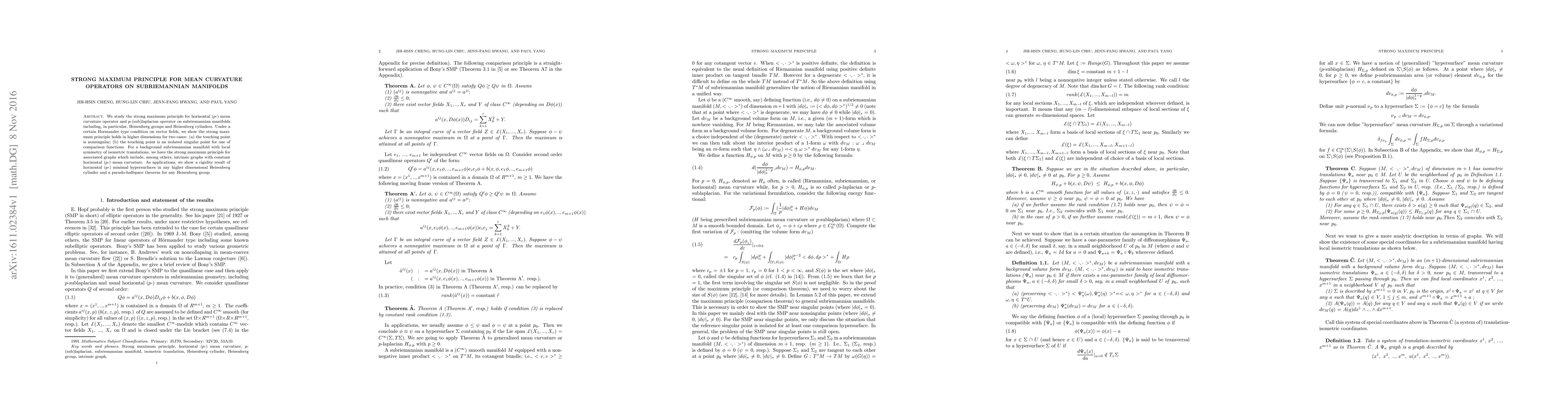 This paper establishes the strong maximum principle for mean curvature operators and p-Laplacians on subriemannian manifolds, particularly Heisenberg groups and cylinders, under Hormander conditions. It demonstrates the principle holds for nonsingular and isolated singular points, leading to rigidity results for minimal hypersurfaces and a pseudo-halfspace theorem.