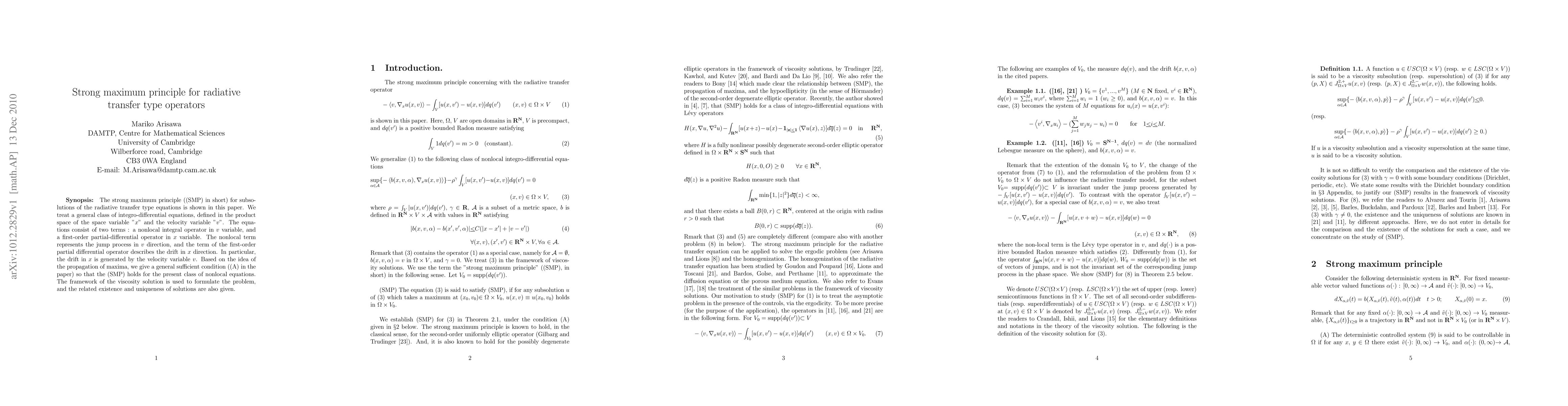 The strong maximum principle ((SMP) in short) for subsolutions of the radiative transfer type equations is shown in this paper. We treat a general class of integro-differential equations, defined in the product space of the space variable "x" and the velocity variable "v". The equations consist of two terms : a nonlocal integral operator in v variable, and a first-order partial-differential operator in x variable. The nonlocal term represents the jump process in v direction, and the term of the first-order partial differential operator describes the drift in x direction. In particular, the drift in x is generated by the velocity variable v. Based on the idea of the propagation of maxima, we give a general sufficient condition ((A) in the paper) so that the (SMP) holds for the present class of nonlocal equations. The framework of the viscosity solution is used to formulate the problem, and the related existence and uniqueness of solutions are also given.