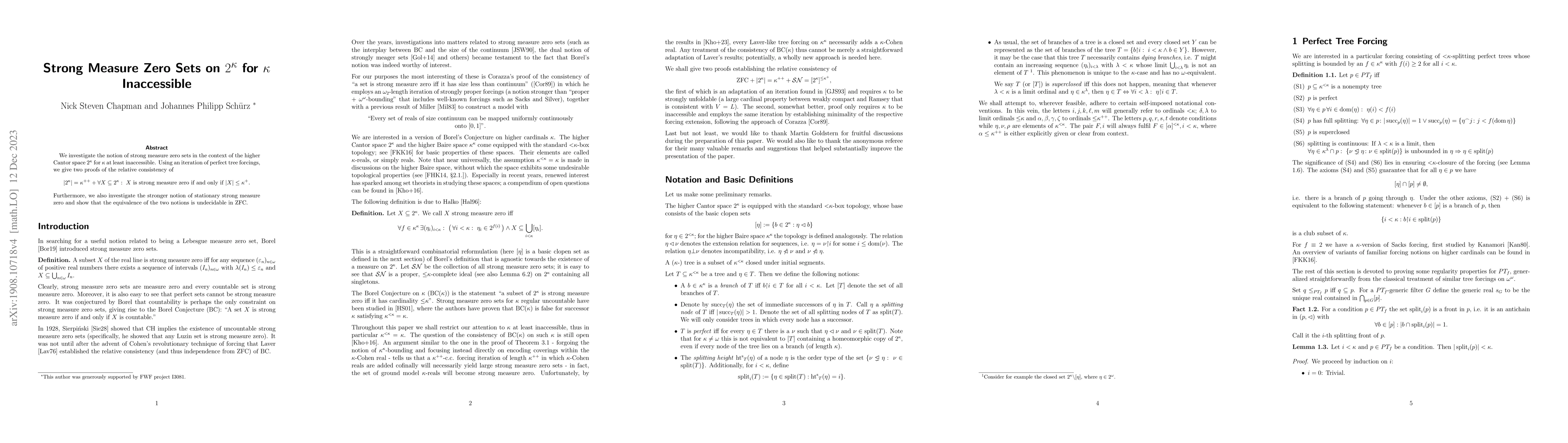 This paper explores strong measure zero sets in the higher Cantor space $2^\kappa$ for inaccessible $\kappa$, proving the relative consistency of a condition linking cardinalities and strong measure zero sets through perfect tree forcing. It also investigates stationary strong measure zero sets and demonstrates the undecidability of their equivalence within ZFC.