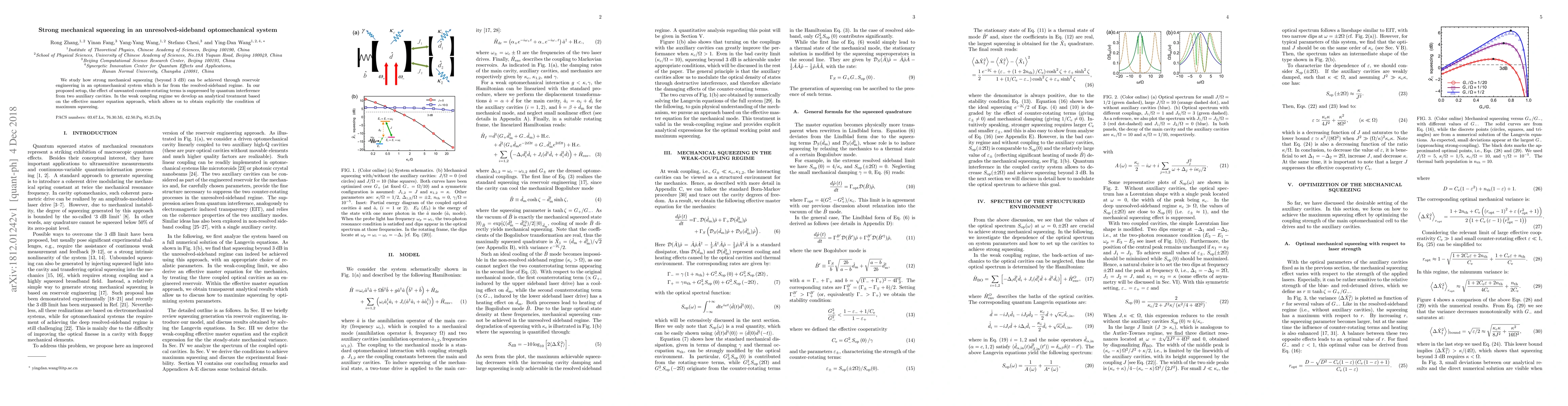 This paper investigates the achievement of strong mechanical squeezing (over 3 dB) in an optomechanical system operating far from the resolved-sideband regime, utilizing reservoir engineering and quantum interference from auxiliary cavities to suppress unwanted counter-rotating terms. An analytical treatment based on the effective master equation is developed to determine the conditions for maximum squeezing.