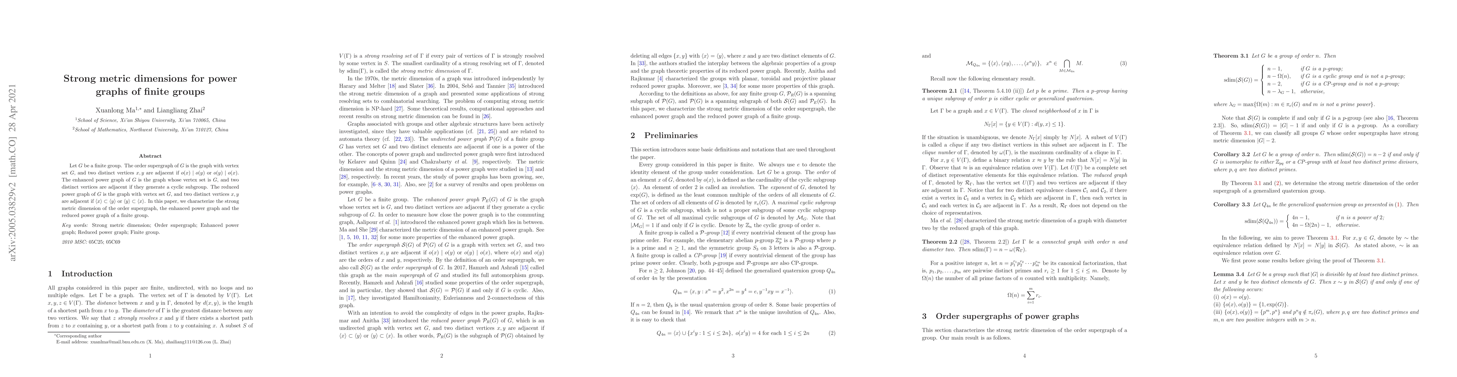Let $G$ be a finite group. The order supergraph of $G$ is the graph with vertex set $G$, and two distinct vertices $x,y$ are adjacent if $o(x)\mid o(y)$ or $o(y)\mid o(x)$. The enhanced power graph of $G$ is the graph whose vertex set is $G$, and two distinct vertices are adjacent if they generate a cyclic subgroup. The reduced power graph of $G$ is the graph with vertex set $G$, and two distinct vertices $x,y$ are adjacent if $\langle x\rangle \subset \langle y\rangle$ or $\langle y\rangle \subset \langle x\rangle$. In this paper, we characterize the strong metric dimension of the order supergraph, the enhanced power graph and the reduced power graph of a finite group.