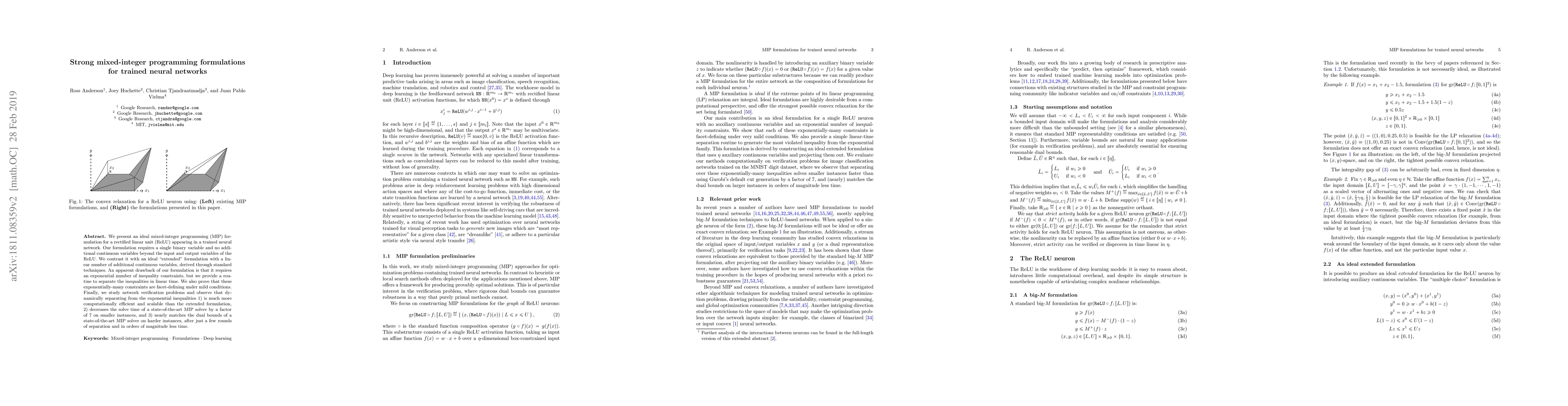 We present an ideal mixed-integer programming (MIP) formulation for a rectified linear unit (ReLU) appearing in a trained neural network. Our formulation requires a single binary variable and no additional continuous variables beyond the input and output variables of the ReLU. We contrast it with an ideal "extended" formulation with a linear number of additional continuous variables, derived through standard techniques. An apparent drawback of our formulation is that it requires an exponential number of inequality constraints, but we provide a routine to separate the inequalities in linear time. We also prove that these exponentially-many constraints are facet-defining under mild conditions. Finally, we study network verification problems and observe that dynamically separating from the exponential inequalities 1) is much more computationally efficient and scalable than the extended formulation, 2) decreases the solve time of a state-of-the-art MIP solver by a factor of 7 on smaller instances, and 3) nearly matches the dual bounds of a state-of-the-art MIP solver on harder instances, after just a few rounds of separation and in orders of magnitude less time.
