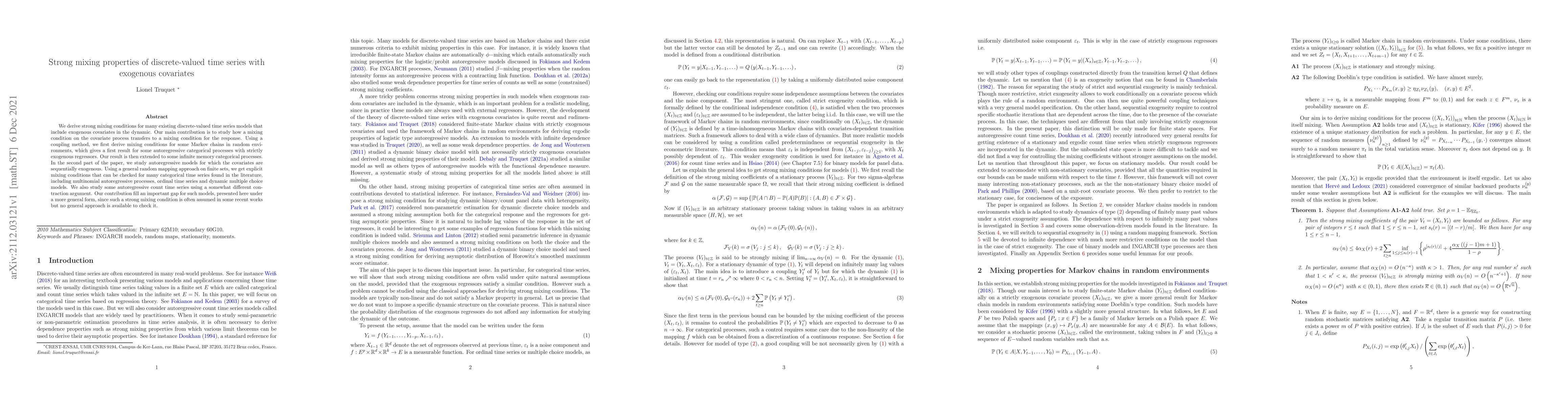 This paper derives strong mixing conditions for discrete-valued time series models with exogenous covariates, demonstrating how mixing conditions on covariates transfer to the response. It extends results to infinite memory processes and provides explicit mixing conditions for various categorical time series models, filling a gap in existing literature.