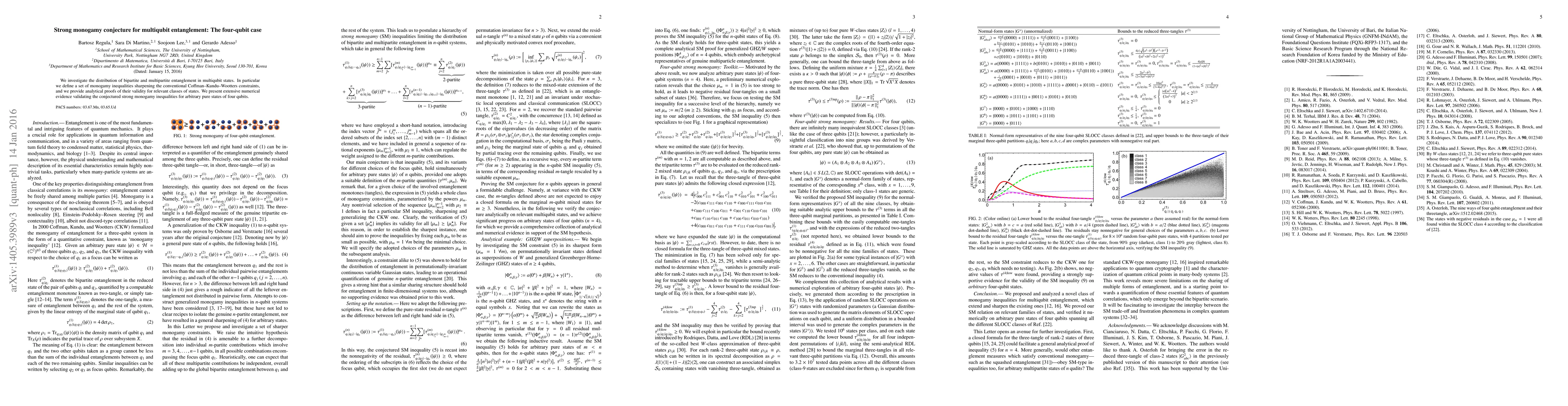 The paper investigates the distribution of entanglement in multiqubit states, defining new monogamy inequalities that refine existing constraints. It provides analytical proofs and extensive numerical evidence supporting the conjectured strong monogamy inequalities for pure four-qubit states.