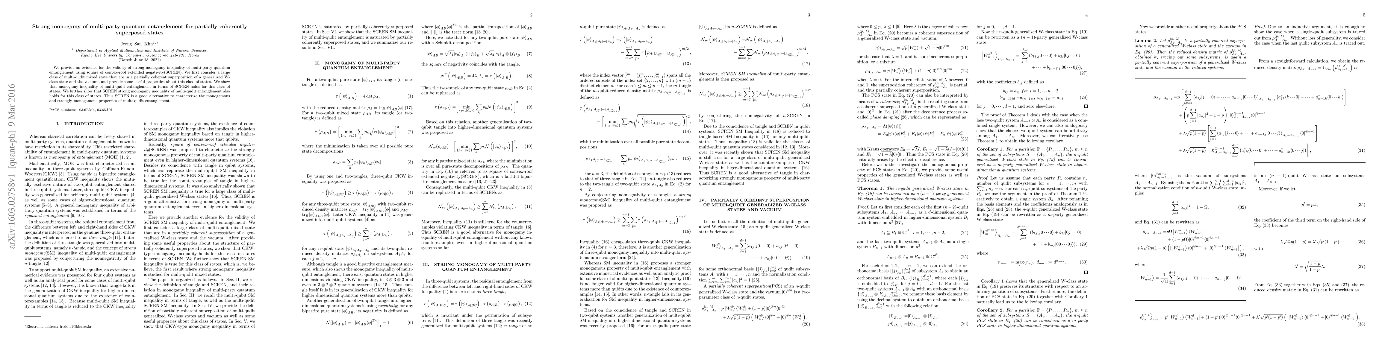 This paper demonstrates the strong monogamy inequality for multi-party quantum entanglement using square of convex-roof extended negativity (SCREN) for a class of partially coherently superposed states. It shows that SCREN effectively characterizes the monogamous and strongly monogamous properties of multi-qudit entanglement.