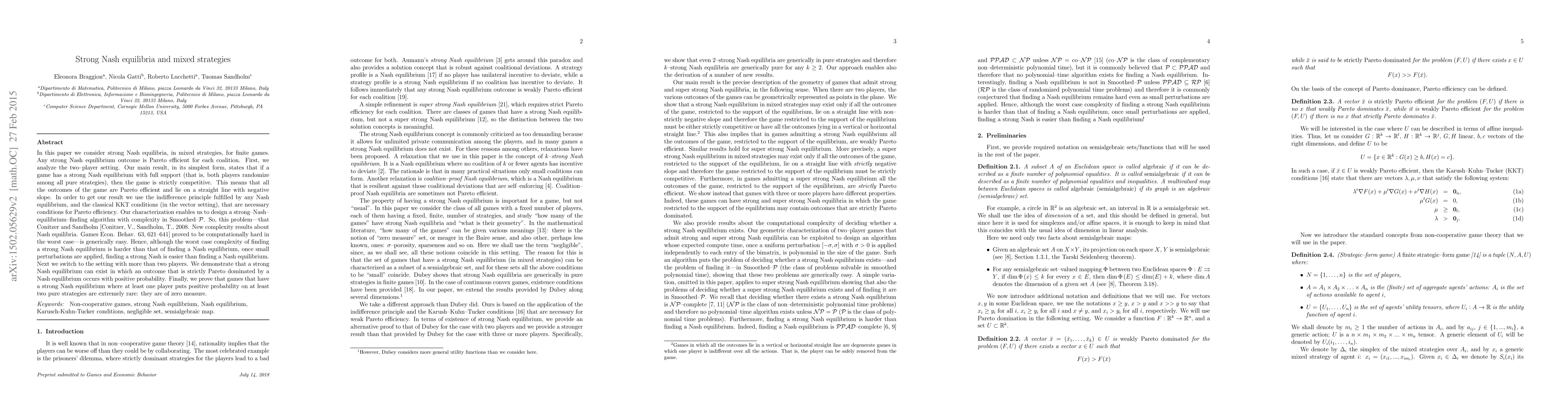 The paper introduces a characterization of strong Nash equilibria in mixed strategies and develops an algorithm to find them with polynomial-time complexity under small perturbations, contrasting with the NP-hardness of finding a strong Nash equilibrium in the worst case.