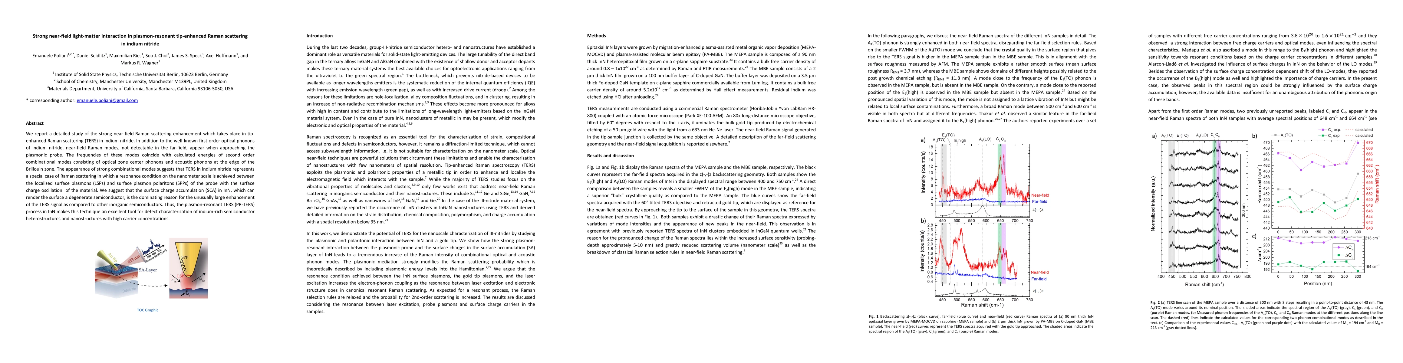 We report a detailed study of the strong near-field Raman scattering enhancement which takes place in tip-enhanced Raman scattering (TERS) in indium nitride. In addition to the well-known first-order optical phonons of indium nitride, near-field Raman modes, not detectable in the far-field, appear when approaching the plasmonic probe. The frequencies of these modes coincide with calculated energies of second order combinational modes consisting of optical zone center phonons and acoustic phonons at the edge of the Brillouin zone. The appearance of strong combinational modes suggests that TERS in indium nitride represents a special case of Raman scattering in which a resonance condition on the nanometer scale is achieved between the localized surface plasmons (LSPs) and surface plasmon polaritons (SPPs) of the probe with the surface charge oscillation of the material. We suggest that the surface charge accumulation (SCA) in InN, which can render the surface a degenerate semiconductor, is the dominating reason for the unusually large enhancement of the TERS signal as compared to other inorganic semiconductors. Thus, the plasmon-resonant TERS (PR-TERS) process in InN makes this technique an excellent tool for defect characterization of indium-rich semiconductor heterostructures and nanostructures with high carrier concentrations.