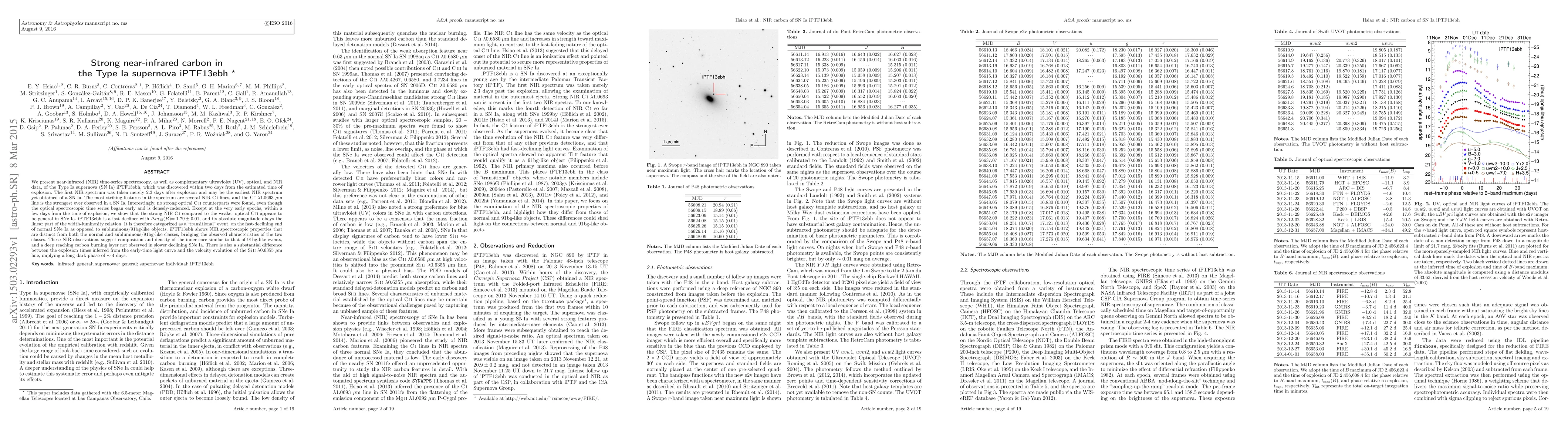 This paper presents near-infrared spectroscopy of the Type Ia supernova iPTF13ebh, revealing strong NIR C I lines, notably the strongest ever observed in a SN Ia, while lacking strong optical C II counterparts. The study categorizes iPTF13ebh as a "transitional" fast decliner, bridging characteristics of normal and subluminous SNe Ia, suggesting unique inner core composition and a deep carbon burning layer.
