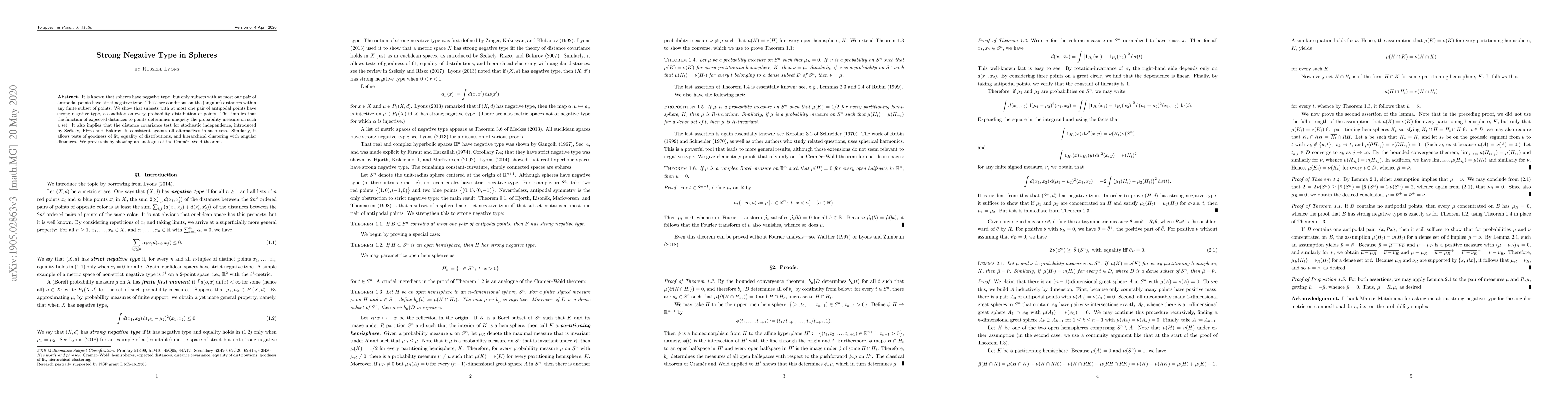 It is known that spheres have negative type, but only subsets with at most one pair of antipodal points have strict negative type. These are conditions on the (angular) distances within any finite subset of points. We show that subsets with at most one pair of antipodal points have strong negative type, a condition on every probability distribution of points. This implies that the function of expected distances to points determines uniquely the probability measure on such a set. It also implies that the distance covariance test for stochastic independence, introduced by Sz\'ekely, Rizzo and Bakirov, is consistent against all alternatives in such sets. Similarly, it allows tests of goodness of fit, equality of distributions, and hierarchical clustering with angular distances. We prove this by showing an analogue of the Cram\'er--Wold theorem.