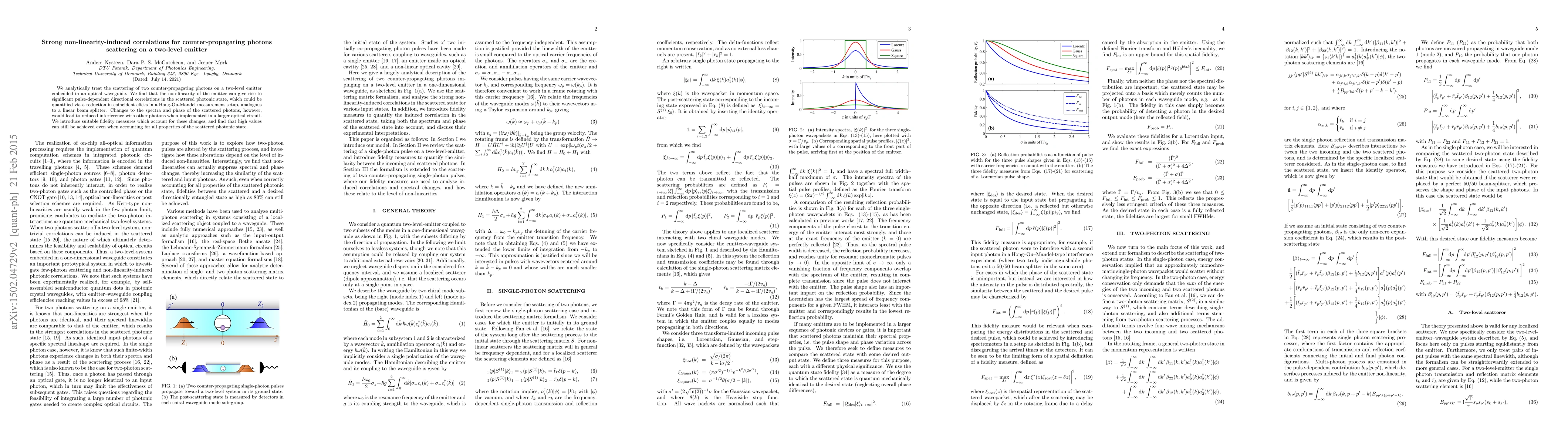 This paper analytically investigates the scattering of counter-propagating photons on a two-level emitter in an optical waveguide, revealing strong non-linear correlations in the scattered photons. These correlations can be quantified by reduced coincident clicks in a Hong-Ou-Mandel measurement setup, despite changes in spectra and phase affecting interference in larger optical circuits.