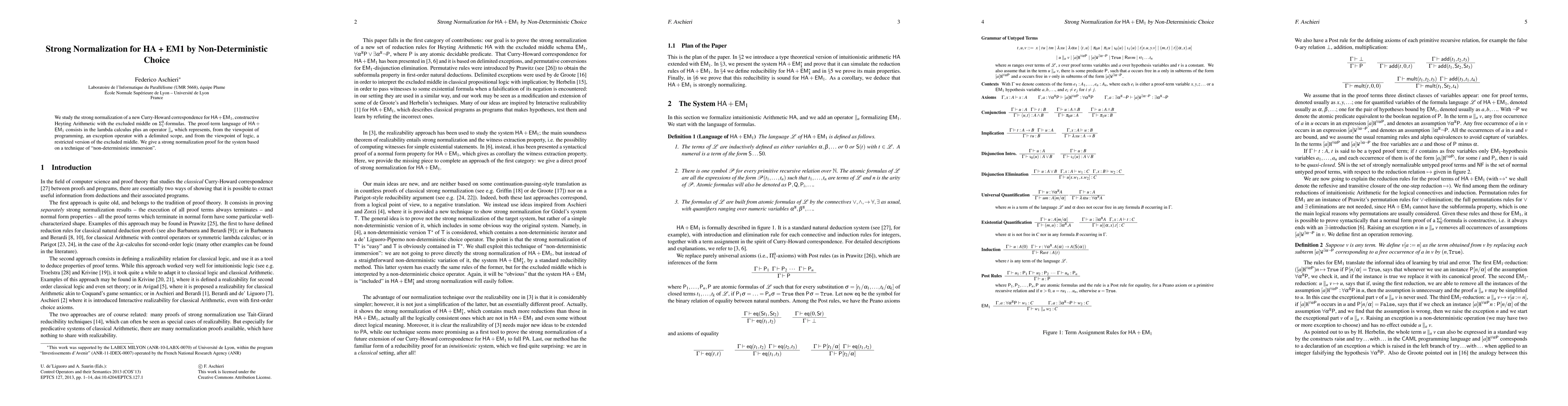 We study the strong normalization of a new Curry-Howard correspondence for HA + EM1, constructive Heyting Arithmetic with the excluded middle on Sigma01-formulas. The proof-term language of HA + EM1 consists in the lambda calculus plus an operator ||_a which represents, from the viewpoint of programming, an exception operator with a delimited scope, and from the viewpoint of logic, a restricted version of the excluded middle. We give a strong normalization proof for the system based on a technique of "non-deterministic immersion".