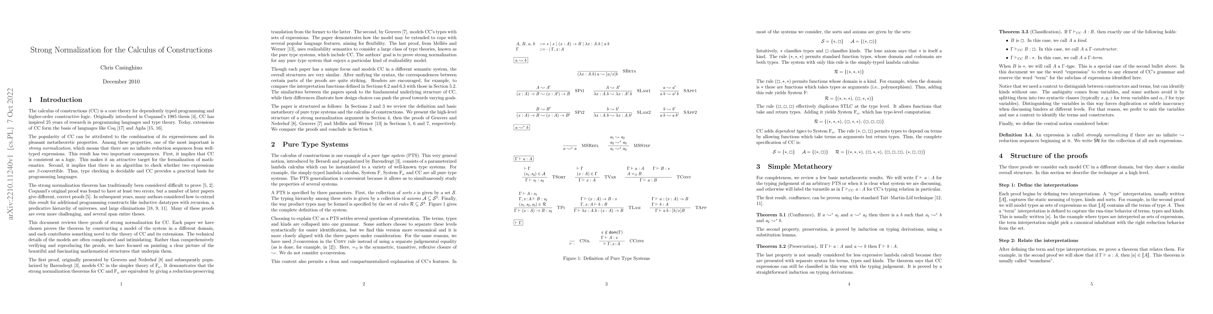 The calculus of constructions (CC) is a core theory for dependently typed programming and higher-order constructive logic. Originally introduced in Coquand's 1985 thesis, CC has inspired 25 years of research in programming languages and type theory. Today, extensions of CC form the basis of languages like Coq and Agda. This survey reviews three proofs of CC's strong normalization property (the fact that there are no infinite reduction sequences from well-typed expressions). It highlights the similarities in the structure of the proofs while showing how their differences are motivated by the varying goals of their authors.
