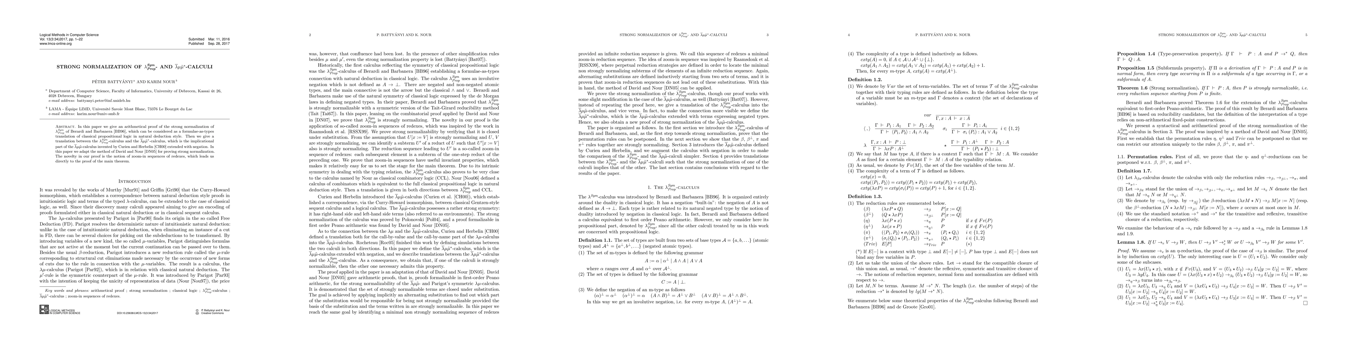In this paper we give an arithmetical proof of the strong normalization of lambda-Sym-Prop of Berardi and Barbanera [1], which can be considered as a formulae-as-types translation of classical propositional logic in natural deduction style. Then we give a translation between the lambda-Sym-Prop-calculus and the lambda-bar-mu-mu-tilde-star-calculus, which is the implicational part of the lambda-bar-mu-mu-tilde-calculus invented by Curien and Herbelin [3] extended with negation. In this paper we adapt the method of David and Nour [4] for proving strong normalization. The novelty in our proof is the notion of zoom-in sequences of redexes, which leads us directly to the proof of the main theorem.