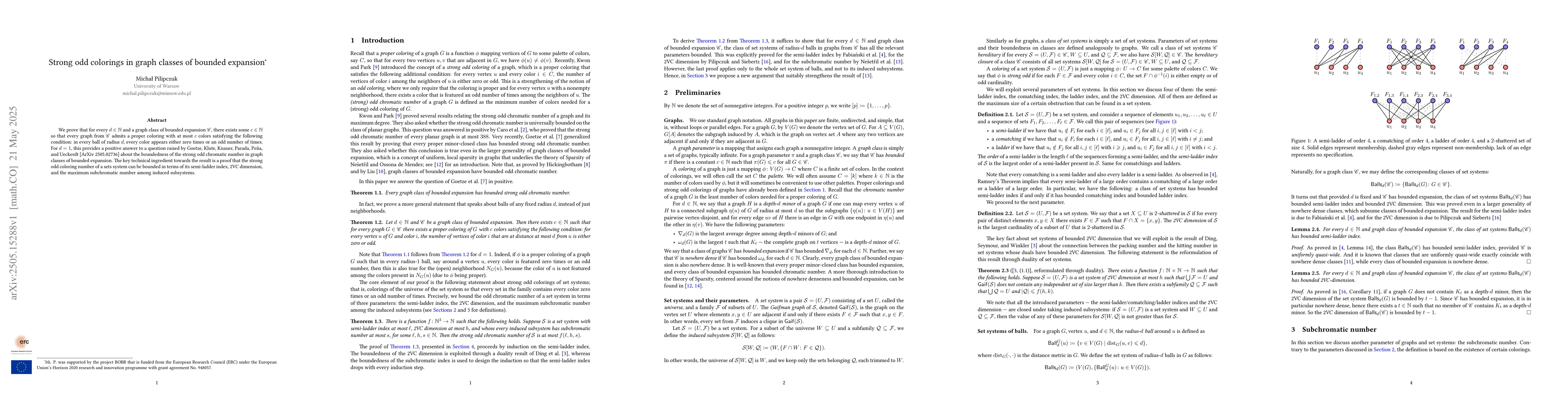 The paper employs graph-theoretic techniques and combinatorial methods, leveraging concepts like bounded expansion graph classes, strong odd colorings, semi-ladder index, 2VC dimension, and maximum subchromatic number among induced subsystems.