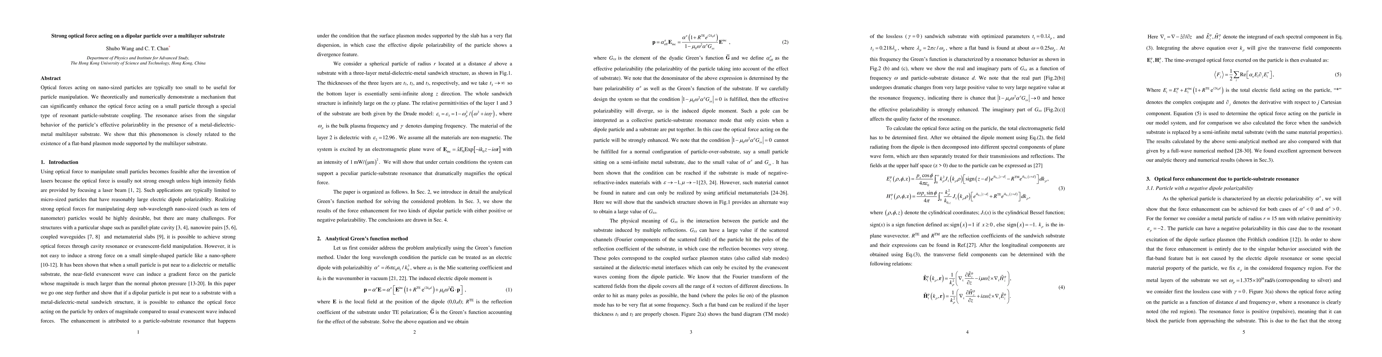 Optical forces acting on nano-sized particles are typically too small to be useful for particle manipulation. We theoretically and numerically demonstrate a mechanism that can significantly enhance the optical force acting on a small particle through a special type of resonant particle-substrate coupling. The resonance arises from the singular behavior of the particle's effective polarizablity in the presence of a metal-dielectric-metal multilayer substrate. We show that this phenomenon is closely related to the existence of a flat-band plasmon mode supported by the multilayer substrate.