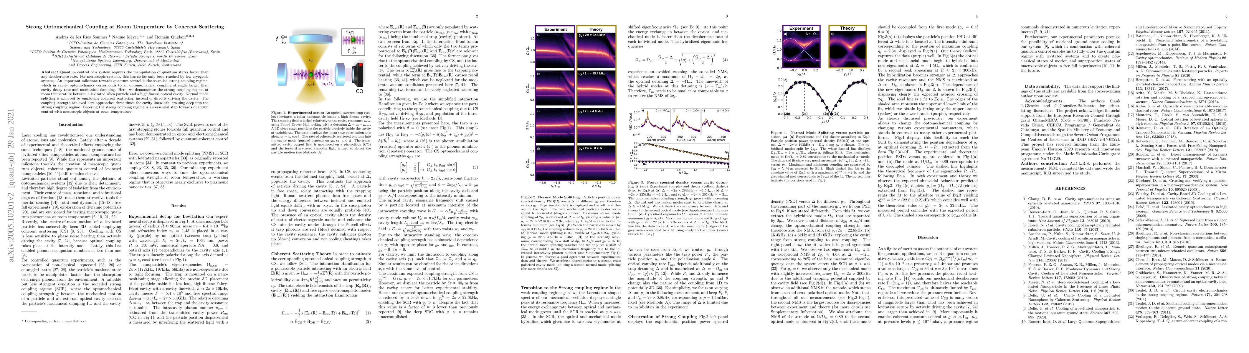 This paper demonstrates strong optomechanical coupling at room temperature using coherent scattering between a levitated silica particle and a high finesse optical cavity, achieving a coupling strength three times the cavity linewidth. This breakthrough enables quantum control of mesoscopic systems without the need for cryogenic cooling.