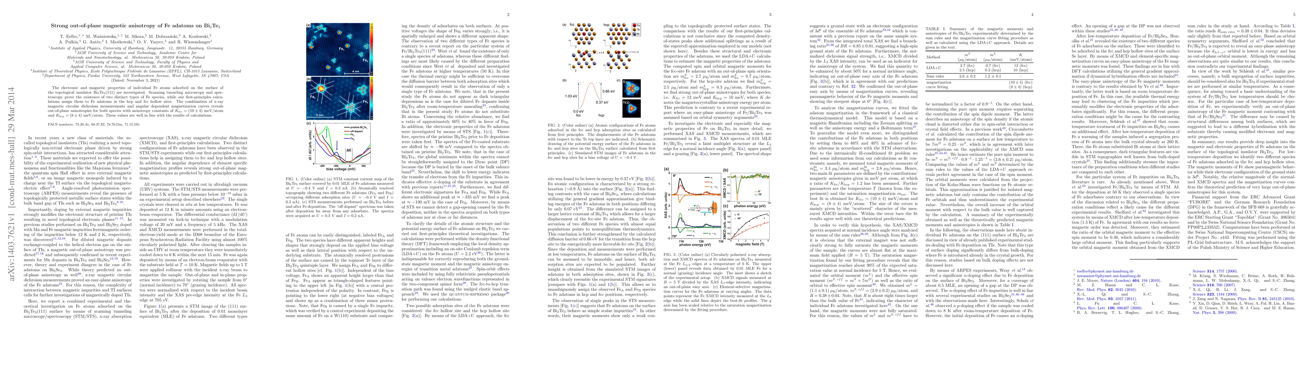 Researchers studied Fe adatoms on Bi2Te3 and found two distinct types of Fe species with out-of-plane magnetic anisotropy constants, confirming calculations.