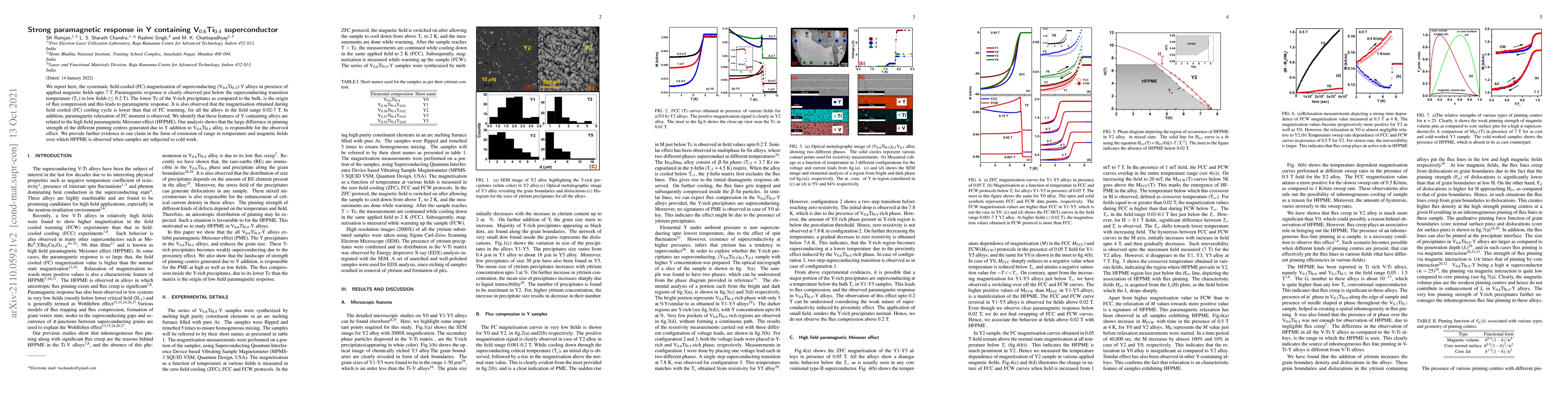 We report here, the systematic field-cooled (FC) magnetisation of superconducting (V$_{0.6}$Ti$_{0.4}$)-Y alloys in presence of applied magnetic fields upto 7 T. Paramagnetic response is clearly observed just below the superconducting transition temperature (T$_{c}$) in low fields ($\leq$0.2 T). The lower T$_{c}$ of the Y-rich precipitates as compared to the bulk, is the origin of flux compression and this leads to paramagnetic response. It is also observed that the magnetisation obtained during field cooled (FC) cooling cycle is lower than that of FC warming, for all the alloys in the field range 0.02-7 T. In addition, paramagnetic relaxation of FC moment is observed. We identify that these features of Y containing alloys are related to the high field paramagnetic Meissner effect (HFPME). Our analysis shows that the large difference in pinning strength of the different pinning centres generated due to Y addition to V$_{0.6}$Ti$_{0.4}$ alloy, is responsible for the observed effect. We provide further evidence to our claim in the form of extension of range in temperature and magnetic fields over which HFPME is observed when samples are subjected to cold work.