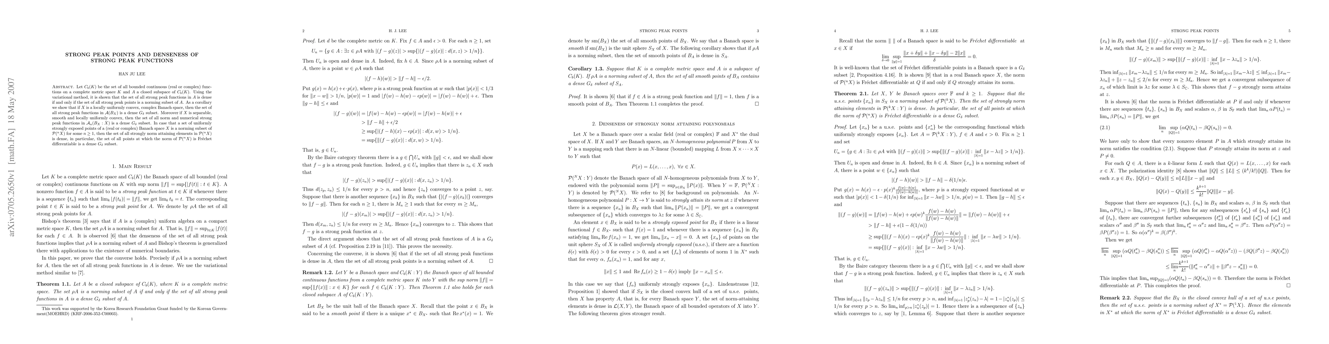 Let $C_b(K)$ be the set of all bounded continuous (real or complex) functions on a complete metric space $K$ and $A$ a closed subspace of $C_b(K)$. Using the variational method, it is shown that the set of all strong peak functions in $A$ is dense if and only if the set of all strong peak points is a norming subset of $A$. As a corollary we show that if $X$ is a locally uniformly convex, complex Banach space, then the set of all strong peak functions in $\mathcal{A}(B_X)$ is a dense $G_\delta$ subset. Moreover if $X$ is separable, smooth and locally uniformly convex, then the set of all norm and numerical strong peak functions in $\mathcal{A}_u(B_X:X)$ is a dense $G_\delta$ subset. In case that a set of uniformly strongly exposed points of a (real or complex) Banach space $X$ is a norming subset of $\mathcal{P}({}^n X)$ for some $n\ge 1$, then the set of all strongly norm attaining elements in $\mathcal{P}({}^n X)$ is dense, in particular, the set of all points at which the norm of $\mathcal{P}({}^n X)$ is Fr\'echet differentiable is a dense $G_\delta$ subset.