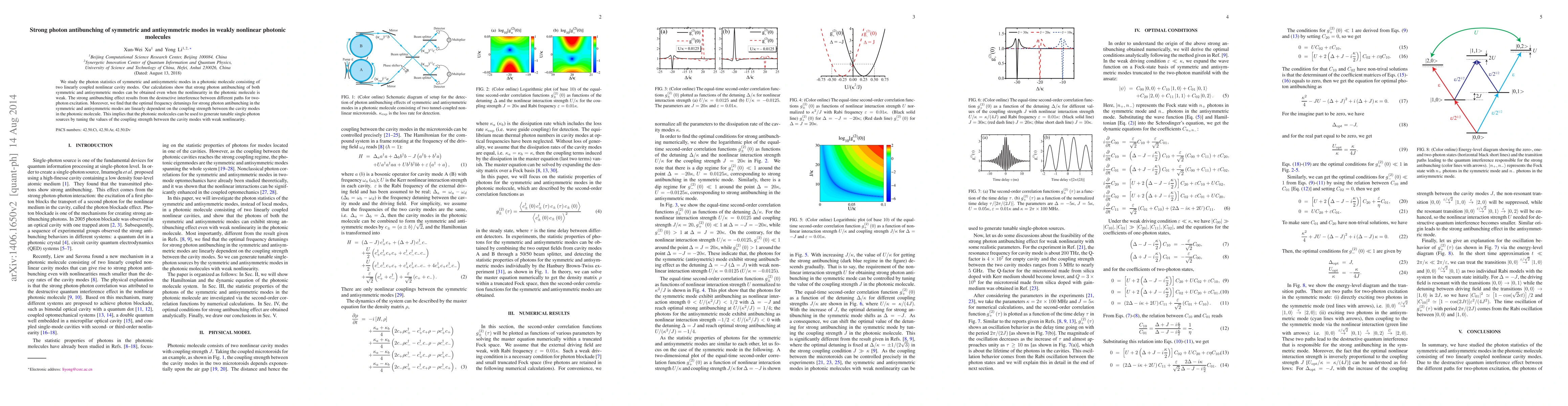 This paper investigates photon statistics in weakly nonlinear photonic molecules, demonstrating strong photon antibunching in both symmetric and antisymmetric modes due to destructive interference. The study finds that optimal frequency detunings for antibunching are linearly dependent on the cavity mode coupling strength, suggesting tunable single-photon sources.