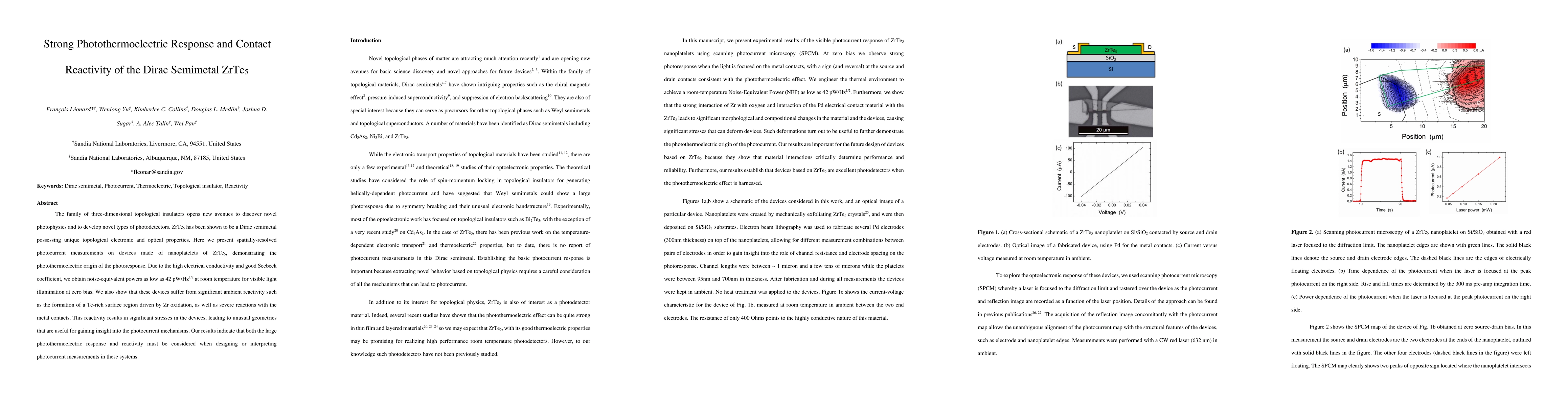 The family of three-dimensional topological insulators opens new avenues to discover novel photophysics and to develop novel types of photodetectors. ZrTe5 has been shown to be a Dirac semimetal possessing unique topological electronic and optical properties. Here we present spatially-resolved photocurrent measurements on devices made of nanoplatelets of ZrTe5, demonstrating the photothermoelectric origin of the photoresponse. Due to the high electrical conductivity and good Seebeck coefficient, we obtain noise-equivalent powers as low as 42 pW/Hz1/2 at room temperature for visible light illumination at zero bias. We also show that these devices suffer from significant ambient reactivity such as the formation of a Te-rich surface region driven by Zr oxidation, as well as severe reactions with the metal contacts. This reactivity results in significant stresses in the devices, leading to unusual geometries that are useful for gaining insight into the photocurrent mechanisms. Our results indicate that both the large photothermoelectric response and reactivity must be considered when designing or interpreting photocurrent measurements in these systems.