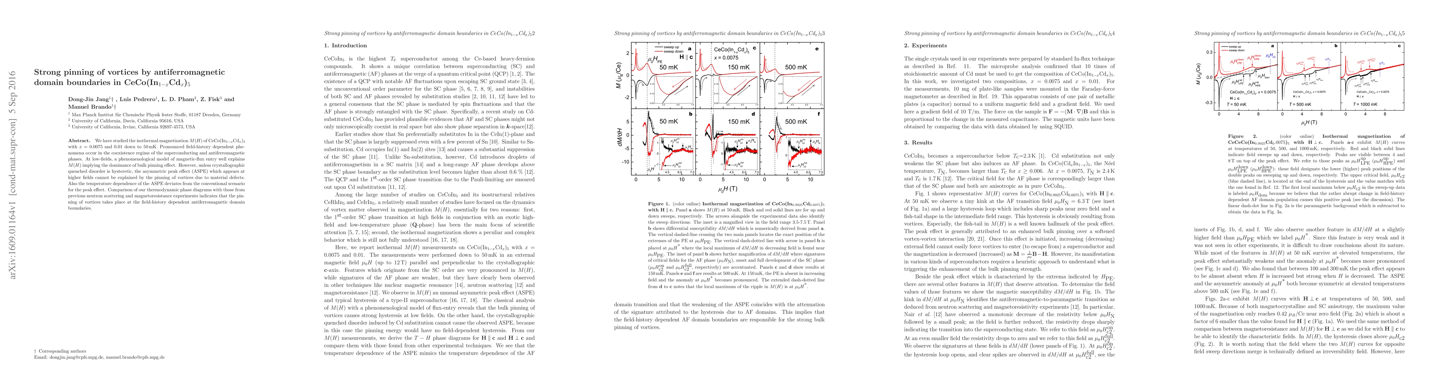 The paper investigates CeCo(In$_{1-x}$Cd$_x$)$_5$ and finds that vortex pinning is strongly influenced by antiferromagnetic domain boundaries in the superconducting and antiferromagnetic phase coexistence regime. The study uses magnetization measurements down to 50 mK, revealing magnetic-flux entry and an asymmetric peak effect (ASPE) not explained by material defects. The findings suggest pinning occurs at field-history dependent antiferromagnetic domain boundaries.
