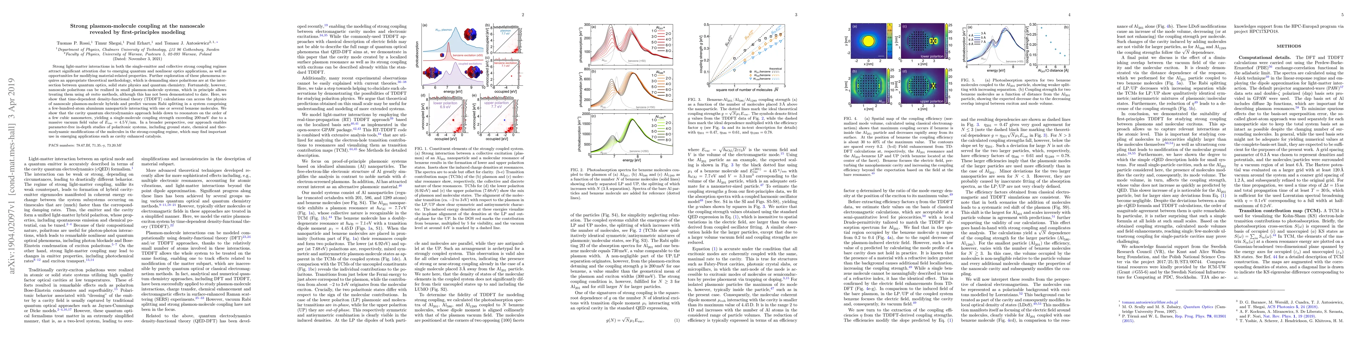 This paper demonstrates that time-dependent density-functional theory (TDDFT) can model strong plasmon-molecule coupling at the nanoscale, predicting vacuum Rabi splitting in aluminum nanoparticle-benzene molecule systems. The study reveals a cavity quantum electrodynamics approach applicable to nanometer-scale resonators, achieving single-molecule coupling strengths exceeding 200 meV.
