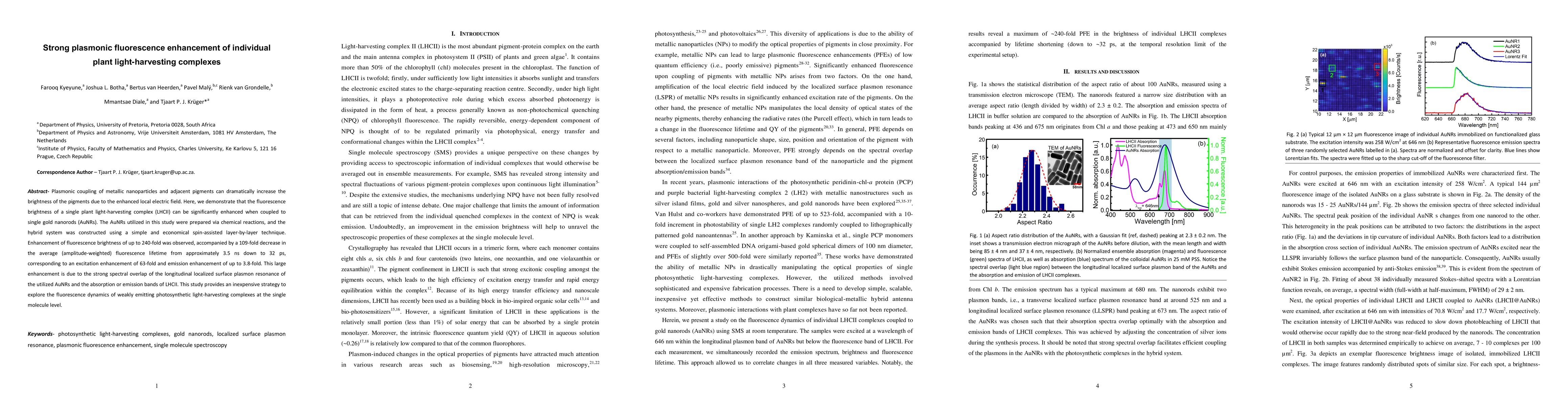 The paper presents a simple and economical method for enhancing the fluorescence of individual plant light-harvesting complexes using plasmonic coupling with gold nanorods, demonstrating significant improvements in brightness and lifetime characteristics.