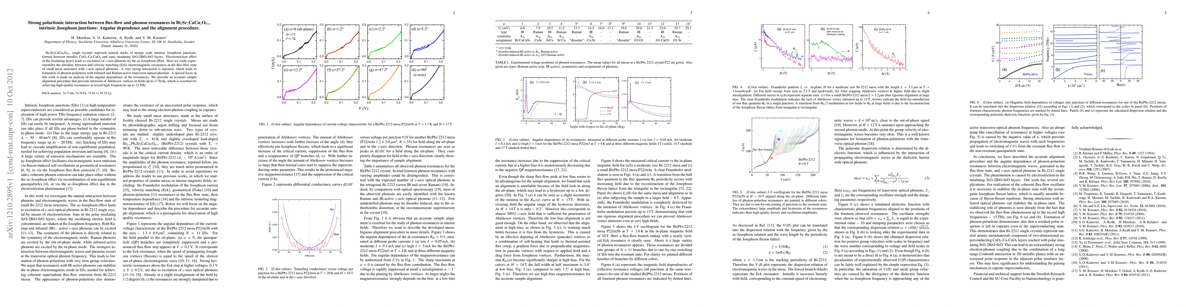 This paper investigates strong polaritonic interactions between flux-flow and phonon resonances in Bi2Sr2CaCu2O8+x intrinsic Josephson junctions, revealing significant angular dependence and an effective alignment procedure to prevent interference from Abrikosov vortices, enabling high-quality resonances up to 13 THz.