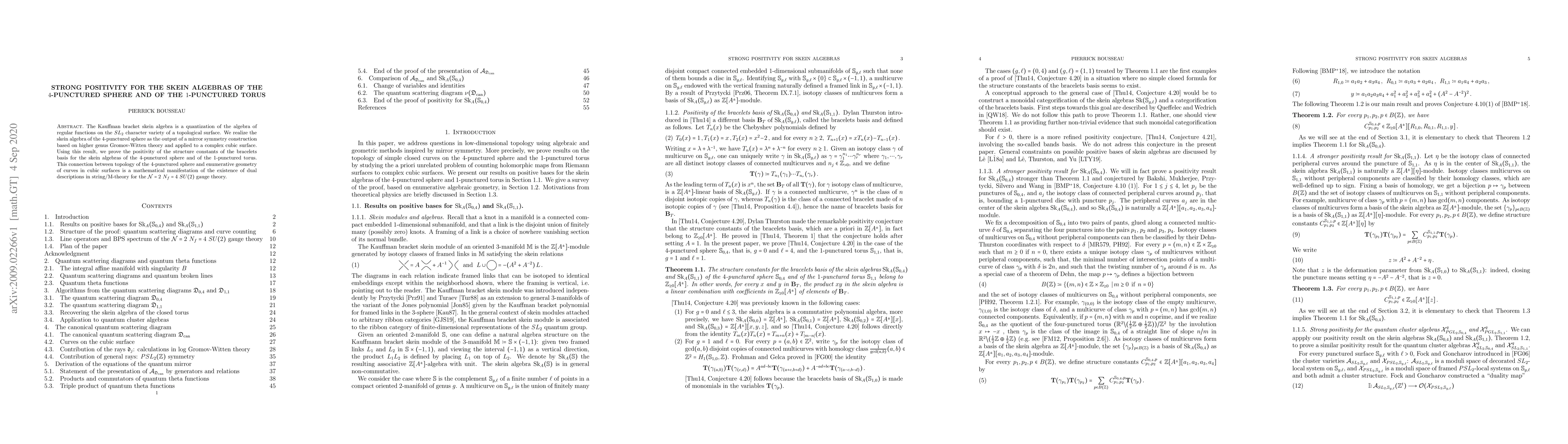 The Kauffman bracket skein algebra is a quantization of the algebra of regular functions on the $SL_2$ character variety of a topological surface. We realize the skein algebra of the $4$-punctured sphere as the output of a mirror symmetry construction based on higher genus Gromov-Witten theory and applied to a complex cubic surface. Using this result, we prove the positivity of the structure constants of the bracelets basis for the skein algebras of the $4$-punctured sphere and of the $1$-punctured torus. This connection between topology of the $4$-punctured sphere and enumerative geometry of curves in cubic surfaces is a mathematical manifestation of the existence of dual descriptions in string/M-theory for the $\mathcal{N}=2$ $N_f=4$ $SU(2)$ gauge theory.