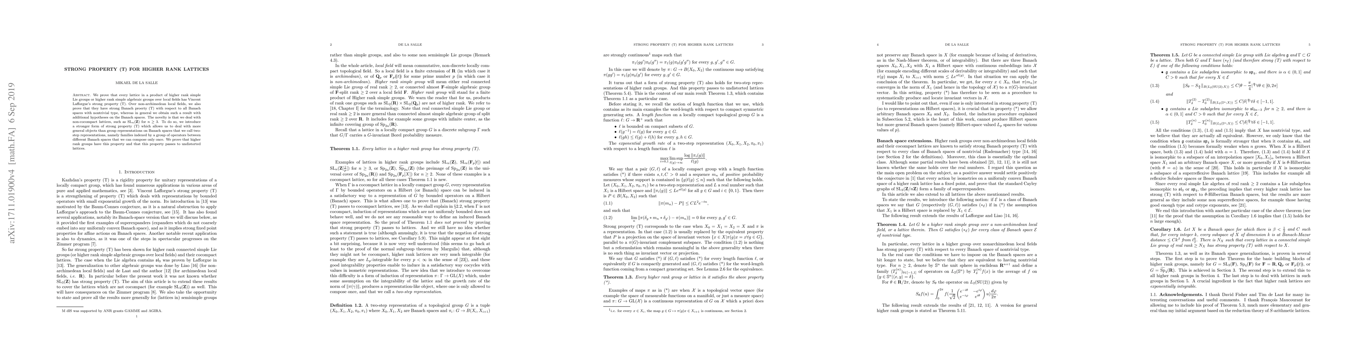 The paper proves that lattices in higher rank simple Lie groups or algebraic groups possess Vincent Lafforgue's strong property (T), extending the result to non-cocompact lattices like $\mathrm{SL}_n(\mathbf{Z})$ for $n \geq 3$. It introduces a novel stronger form of strong property (T) and demonstrates its applicability to two-step representations.