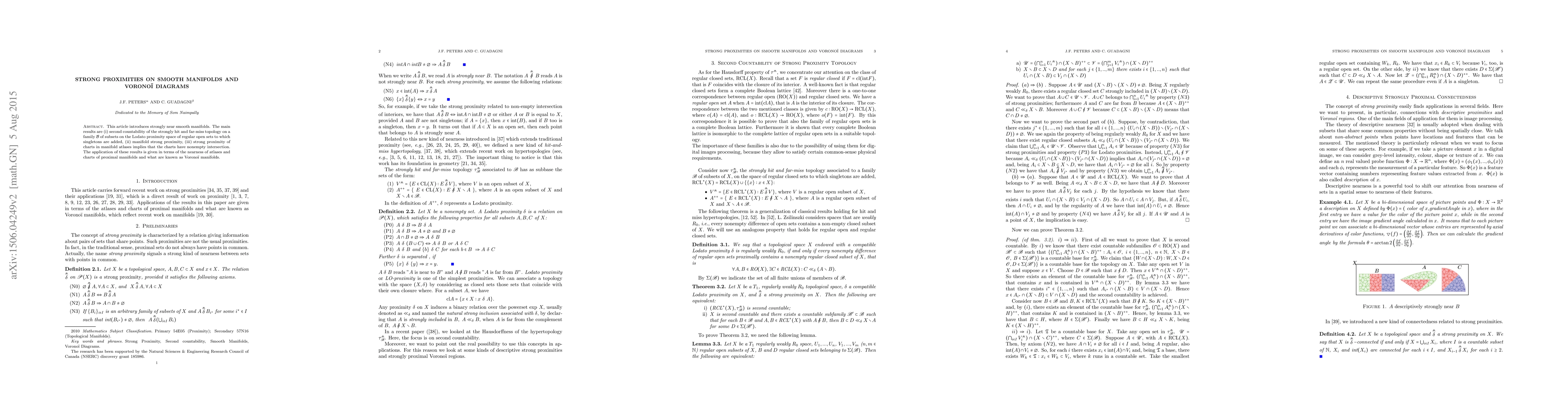 This paper explores strong proximities on smooth manifolds and introduces the concept of strongly near smooth manifolds. It establishes the second countability of the topology on a family of subsets and demonstrates that strong proximity of charts in manifold atlases implies nonempty intersections.
