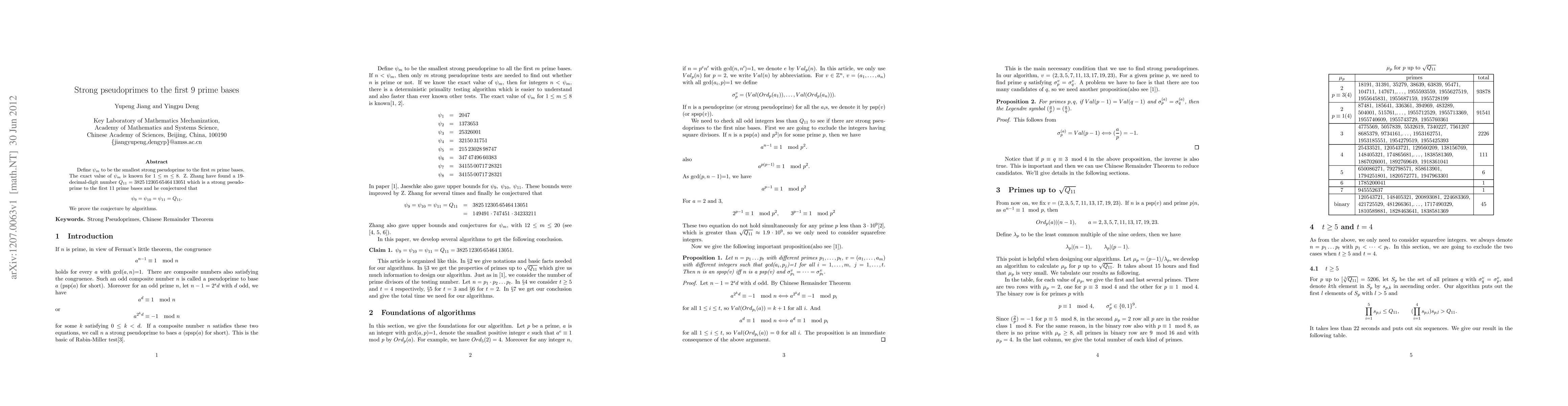 This paper proves a conjecture by Z. Zhang, demonstrating that a specific 19-decimal-digit number, $Q_{11}$, is indeed the smallest strong pseudprime to the first nine prime bases. The proof is achieved through the implementation of algorithms.