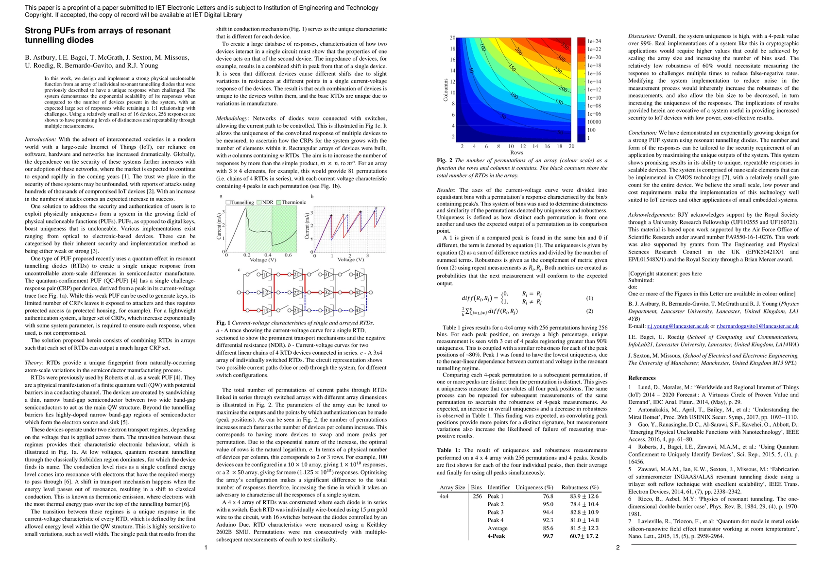 In this work, we design and implement a strong physical uncloneable function from an array of individual resonant tunnelling diodes that were previously described to have a unique response when challenged. The system demonstrates the exponential scalability of its responses when compared to the number of devices present in the system, with an expected large set of responses while retaining a 1:1 relationship with challenges. Using a relatively small set of 16 devices, 256 responses are shown to have promising levels of distinctness and repeatability through multiple measurements.
