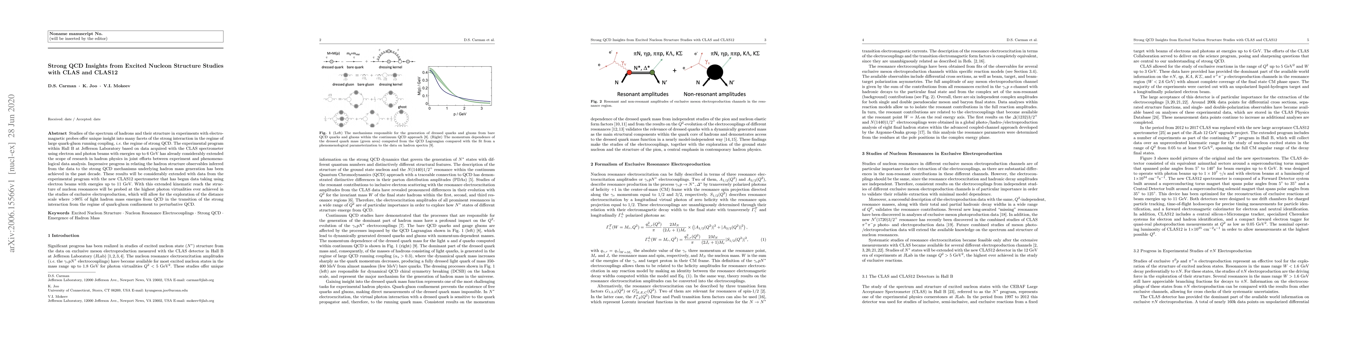 Studies of the spectrum of hadrons and their structure in experiments with electromagnetic probes offer unique insight into many facets of the strong interaction in the regime of large quark-gluon running coupling, {\it i.e.} the regime of strong QCD. The experimental program within Hall~B at Jefferson Laboratory based on data acquired with the CLAS spectrometer using electron and photon beams with energies up to 6~GeV has already considerably extended the scope of research in hadron physics in joint efforts between experiment and phenomenological data analysis. Impressive progress in relating the hadron structure observables inferred from the data to the strong QCD mechanisms underlying hadron mass generation has been achieved in the past decade. These results will be considerably extended with data from the experimental program with the new CLAS12 spectrometer that has begun data taking using electron beams with energies up to 11~GeV. With this extended kinematic reach the structure of nucleon resonances will be probed at the highest photon virtualities ever achieved in the studies of exclusive electroproduction, which will allow for the exploration of the distance scale where $>$98\% of light hadron mass emerges from QCD in the transition of the strong interaction from the regime of quark-gluon confinement to perturbative QCD.