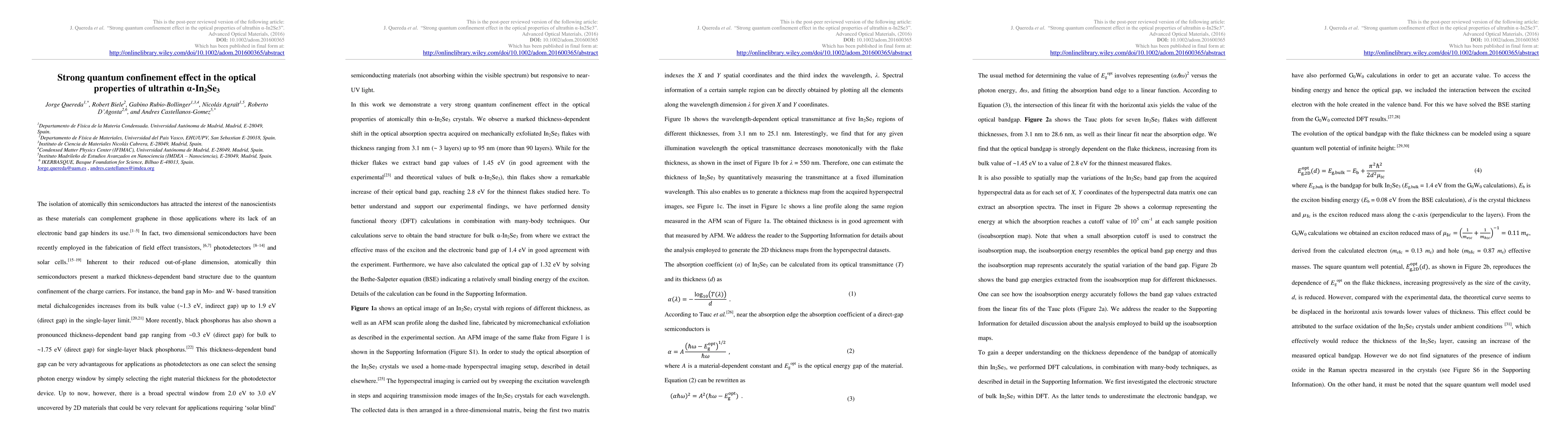 The effect of quantum confinement in the optical absorption spectra of atomically thin {\alpha}-In2Se3 crystals is studied, observing a huge thickness-dependent shift in the optical band gap of exfoliated {\alpha}-In2Se3 flakes. The band gap variation reported here is among the largest found in semiconductor crystals and spans a region of the near-UV spectrum uncovered by other 2D semiconductors.