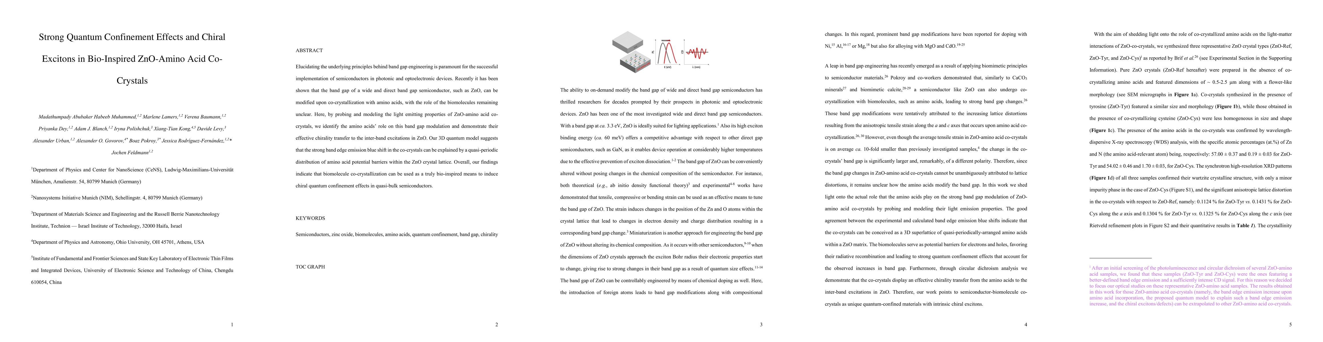 Elucidating the underlying principles behind band gap engineering is paramount for the successful implementation of semiconductors in photonic and optoelectronic devices. Recently it has been shown that the band gap of a wide and direct band gap semiconductor, such as ZnO, can be modified upon co-crystallization with amino acids, with the role of the biomolecules remaining unclear. Here, by probing and modeling the light emitting properties of ZnO-amino acid co-crystals, we identify the amino acids role on this band gap modulation and demonstrate their effective chirality transfer to the inter-band excitations in ZnO. Our 3D quantum model suggests that the strong band edge emission blue shift in the co-crystals can be explained by a quasi-periodic distribution of amino acid potential barriers within the ZnO crystal lattice. Overall, our findings indicate that biomolecule co-crystallization can be used as a truly bio-inspired means to induce chiral quantum confinement effects in quasi-bulk semiconductors.