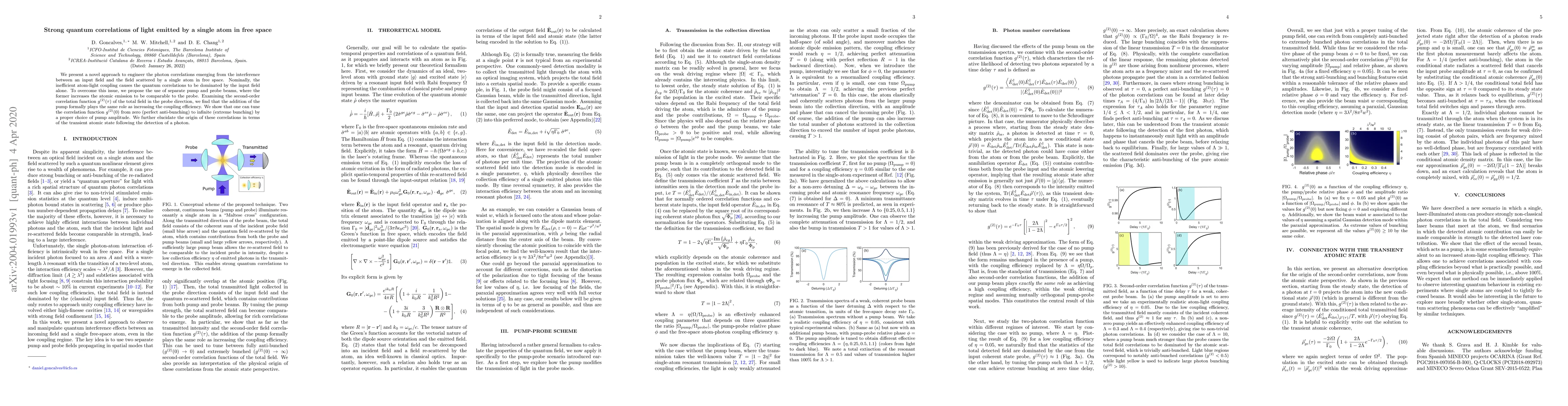 This research proposes a method to enhance quantum correlations in light emitted by a single atom in free space using separate pump and probe beams, achieving tunable photon correlations by adjusting the pump amplitude, and explains the underlying atomic state dynamics.