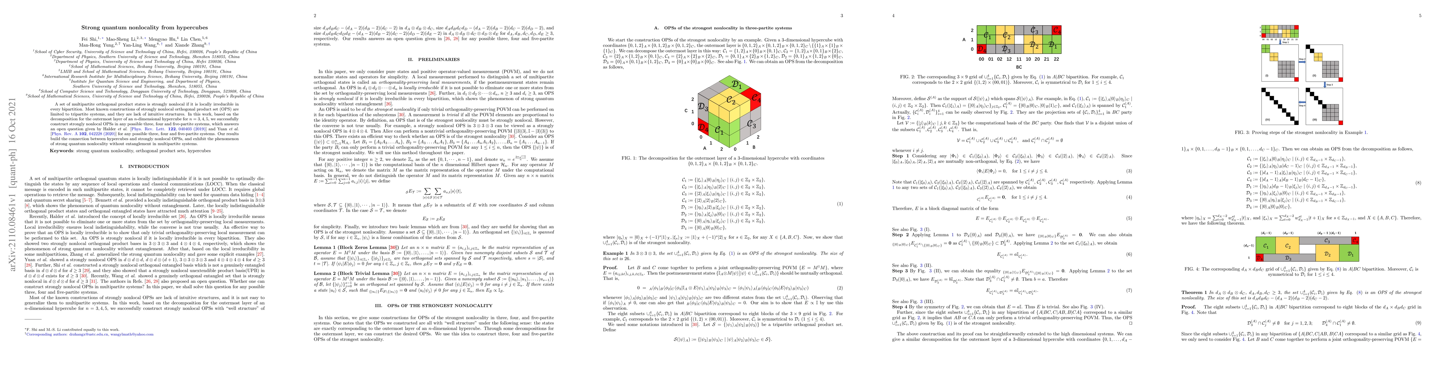 A set of multipartite orthogonal product states is strongly nonlocal if it is locally irreducible in every bipartition. Most known constructions of strongly nonlocal orthogonal product set (OPS) are limited to tripartite systems, and they are lack of intuitive structures. In this work, based on the decomposition for the outermost layer of an $n$-dimensional hypercube for $n= 3,4,5$, we successfully construct strongly nonlocal OPSs in any possible three, four and five-partite systems, which answers an open question given by Halder et al. [Phys. Rev. Lett.122, 040403 (2019)] and Yuan et al. [Phys. Rev. A102, 042228 (2020)] for any possible three, four and five-partite systems. Our results build the connection between hypercubes and strongly nonlocal OPSs, and exhibit the phenomenon of strong quantum nonlocality without entanglement in multipartite systems.