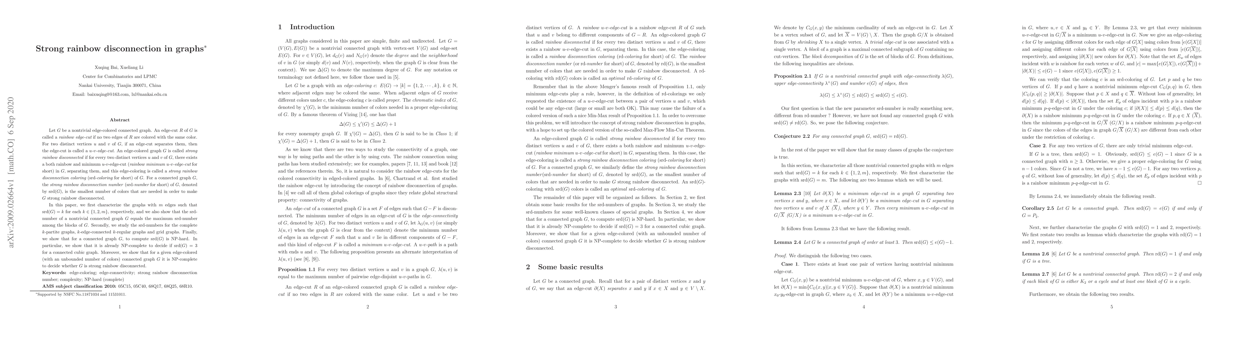 Let $G$ be a nontrivial edge-colored connected graph. An edge-cut $R$ of $G$ is called a {\it rainbow edge-cut} if no two edges of $R$ are colored with the same color. For two distinct vertices $u$ and $v$ of $G$, if an edge-cut separates them, then the edge-cut is called a {\it $u$-$v$-edge-cut}. An edge-colored graph $G$ is called \emph{strong rainbow disconnected} if for every two distinct vertices $u$ and $v$ of $G$, there exists a both rainbow and minimum $u$-$v$-edge-cut ({\it rainbow minimum $u$-$v$-edge-cut} for short) in $G$, separating them, and this edge-coloring is called a {\it strong rainbow disconnection coloring} (srd-{\it coloring} for short) of $G$. For a connected graph $G$, the \emph{strong rainbow disconnection number} (srd-{\it number} for short) of $G$, denoted by $\textnormal{srd}(G)$, is the smallest number of colors that are needed in order to make $G$ strong rainbow disconnected. In this paper, we first characterize the graphs with $m$ edges such that $\textnormal{srd}(G)=k$ for each $k \in \{1,2,m\}$, respectively, and we also show that the srd-number of a nontrivial connected graph $G$ equals the maximum srd-number among the blocks of $G$. Secondly, we study the srd-numbers for the complete $k$-partite graphs, $k$-edge-connected $k$-regular graphs and grid graphs. Finally, we show that for a connected graph $G$, to compute $\textnormal{srd}(G)$ is NP-hard. In particular, we show that it is already NP-complete to decide if $\textnormal{srd}(G)=3$ for a connected cubic graph. Moreover, we show that for a given edge-colored (with an unbounded number of colors) connected graph $G$ it is NP-complete to decide whether $G$ is strong rainbow disconnected.