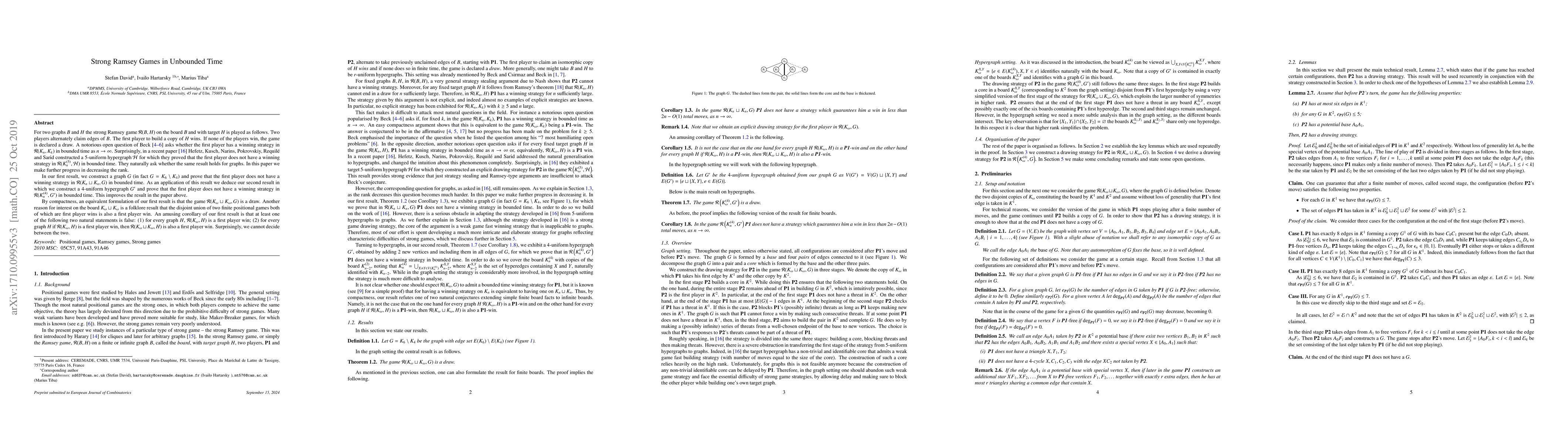 For two graphs $B$ and $H$ the strong Ramsey game $\mathcal{R}(B,H)$ on the board $B$ and with target $H$ is played as follows. Two players alternately claim edges of $B$. The first player to build a copy of $H$ wins. If none of the players win, the game is declared a draw. A notorious open question of Beck asks whether the first player has a winning strategy in $\mathcal{R}(K_n,K_k)$ in bounded time as $n\rightarrow\infty$. Surprisingly, in a recent paper Hefetz et al. constructed a $5$-uniform hypergraph $\mathcal{H}$ for which they proved that the first player does not have a winning strategy in $\mathcal{R}(K_n^{(5)},\mathcal{H})$ in bounded time. They naturally ask whether the same result holds for graphs. In this paper we make further progress in decreasing the rank. In our first result, we construct a graph $G$ (in fact $G=K_6\setminus K_4$) and prove that the first player does not have a winning strategy in $\mathcal{R}(K_n \sqcup K_n,G)$ in bounded time. As an application of this result we deduce our second result in which we construct a $4$-uniform hypergraph $G'$ and prove that the first player does not have a winning strategy in $\mathcal{R}(K_n^{(4)},G')$ in bounded time. This improves the result in the paper above. An equivalent formulation of our first result is that the game $\mathcal{R}(K_\omega\sqcup K_\omega,G)$ is a draw. Another reason for interest on the board $K_\omega\sqcup K_\omega$ is a folklore result that the disjoint union of two finite positional games both of which are first player wins is also a first player win. An amusing corollary of our first result is that at least one of the following two natural statements is false: (1) for every graph $H$, $\mathcal{R}(K_\omega,H)$ is a first player win; (2) for every graph $H$ if $\mathcal{R}(K_\omega,H)$ is a first player win, then $\mathcal{R}(K_\omega\sqcup K_\omega,H)$ is also a first player win.