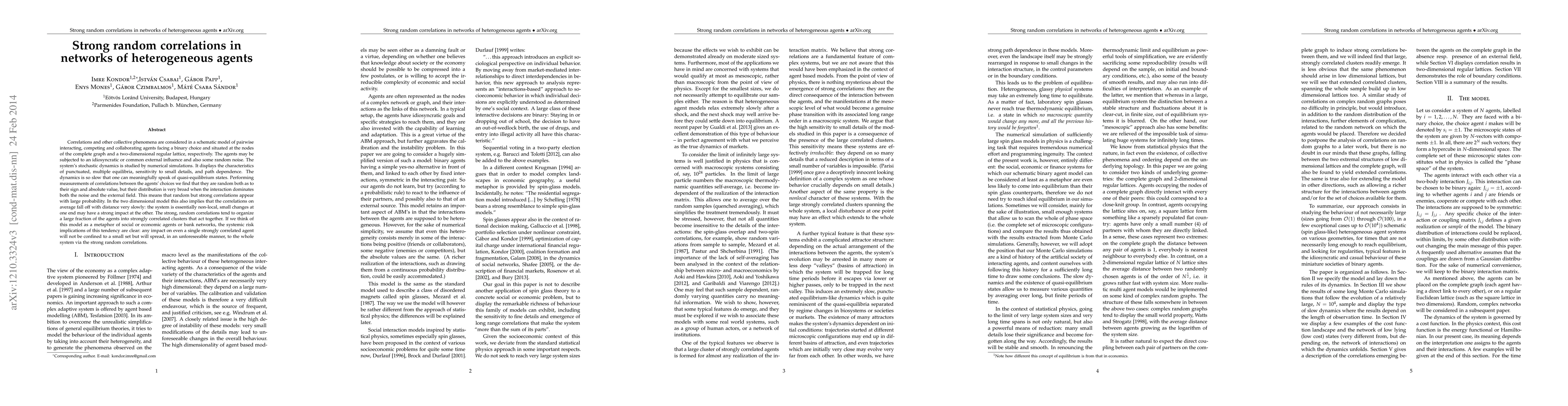 Correlations and other collective phenomena in a schematic model of heterogeneous binary agents (individual spin-glass samples) are considered on the complete graph and also on 2d and 3d regular lattices. The system's stochastic dynamics is studied by numerical simulations. The dynamics is so slow that one can meaningfully speak of quasi-equilibrium states. Performing measurements of correlations in such a quasi-equilibrium state we find that they are random both as to their sign and absolute value, but on average they fall off very slowly with distance in all instances that we have studied. This means that the system is essentially non-local, small changes at one end may have a strong impact at the other. Correlations and other local quantities are extremely sensitive to the boundary conditions all across the system, although this sensitivity disappears upon averaging over the samples or partially averaging over the agents. The strong, random correlations tend to organize a large fraction of the agents into strongly correlated clusters that act together. If we think about this model as a distant metaphor of economic agents or bank networks, the systemic risk implications of this tendency are clear: any impact on even a single strongly correlated agent will spread, in an unforeseeable manner, to the whole system via the strong random correlations.