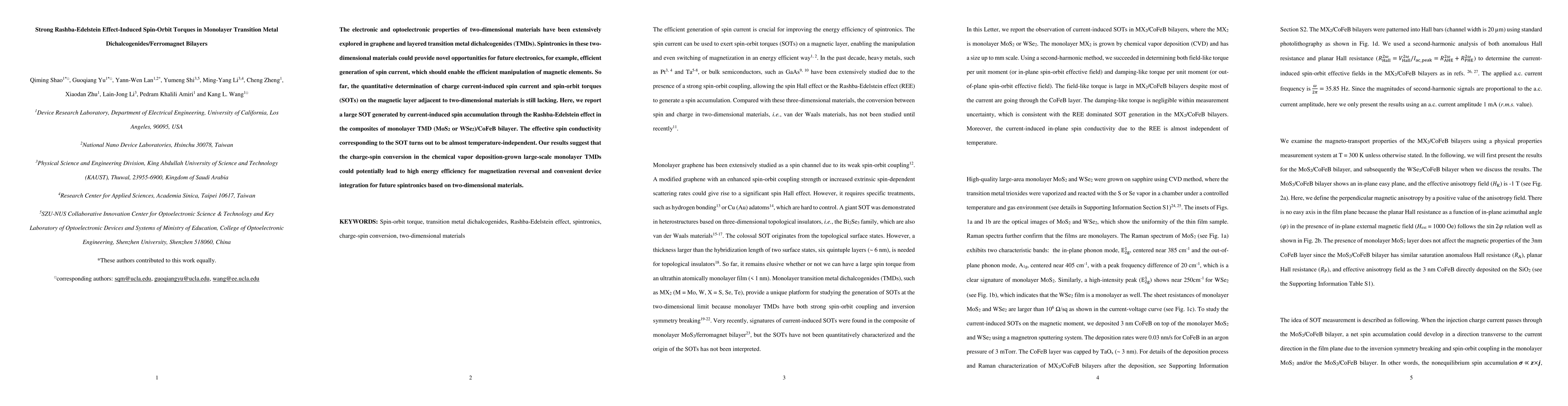This paper reports a significant Rashba-Edelstein effect-induced spin-orbit torque in monolayer transition-metal dichalcogenide/ferromagnet bilayers, demonstrating efficient charge-to-spin current conversion with temperature-independent spin conductivity, suggesting high energy efficiency for future spintronics applications.