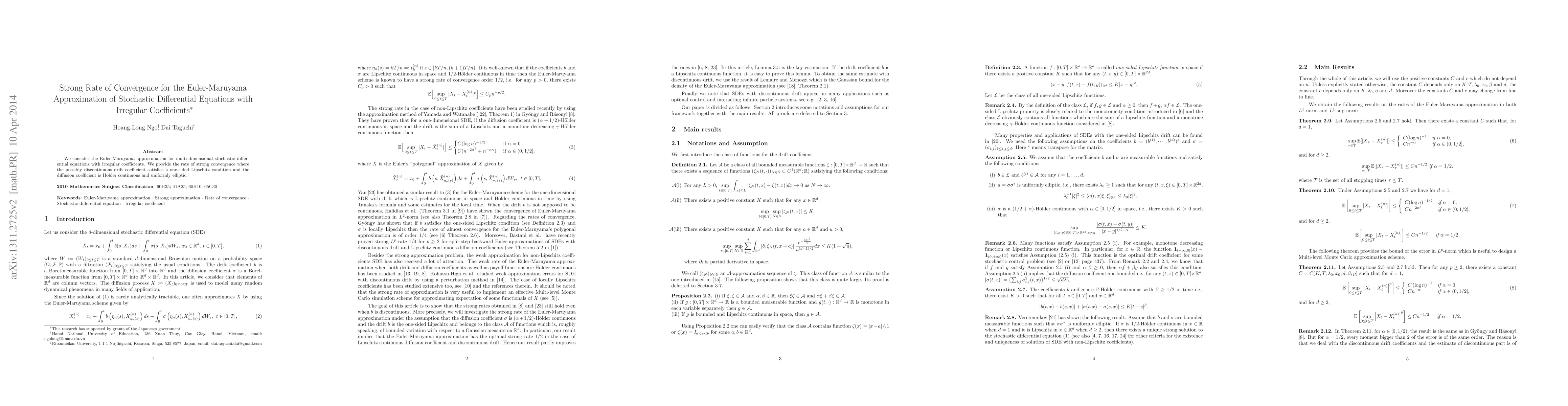 Summary: This paper establishes the strong rate of convergence for the Euler-Maruyama method in approximating stochastic differential equations with irregular coefficients, under conditions on the drift and diffusion terms. The drift term's discontinuity is controlled by a one-sided Lipschitz condition, while the diffusion term is H\"older continuous.