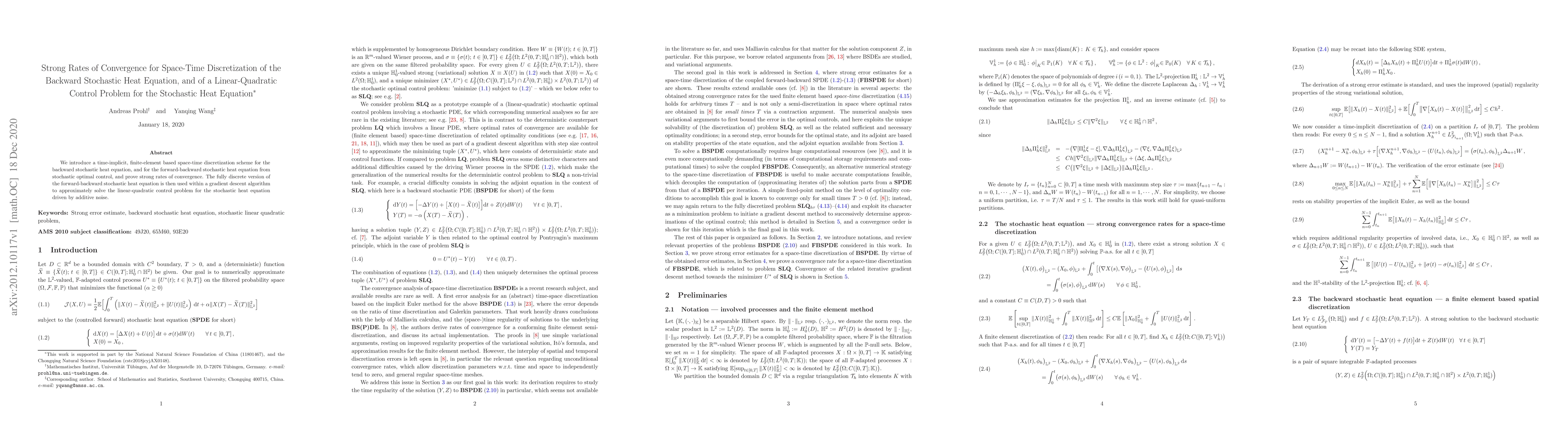 We introduce a time-implicit, finite-element based space-time discretization scheme for the backward stochastic heat equation, and for the forward-backward stochastic heat equation from stochastic optimal control, and prove strong rates of convergence. The fully discrete version of the forward-backward stochastic heat equation is then used within a gradient descent algorithm to approximately solve the linear-quadratic control problem for the stochastic heat equation driven by additive noise.