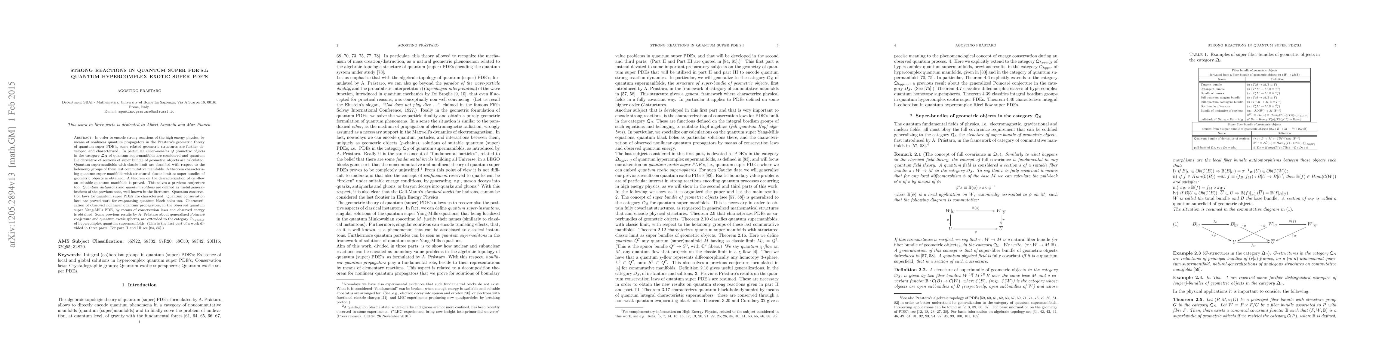 This is a work in three parts, devoted to encode strong reactions of the high energy physics, in the algebraic topologic theory of quantum super PDE's, (previously formulated by A. Pr\'astaro). In particular strong reactions are characterized by means of boundary value problems in quantum super PDE's. In such a way one obtains representations of quantum nonlinear propagators in quantum super PDE's, by means of elementary ones (quantum handle decompositions of quantum nonlinear propagators). These are useful to encode nuclear and subnuclear reactions in quantum physics. Pr\'astaro's geometric theory of quantum PDE's allows us to obtain constructive and dynamically justified answers to some important open problems in high energy physics.