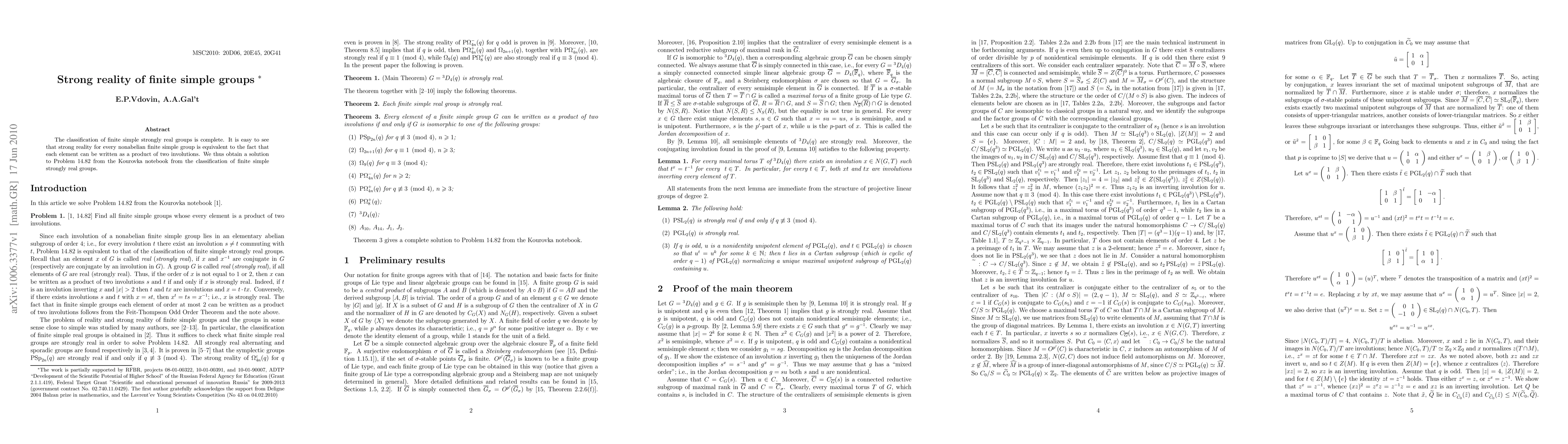 The paper presents a complete classification of finite simple strongly real groups, demonstrating that strong reality is equivalent to each element being expressible as a product of two involutions, thus solving Problem 14.82 from the Kourovka notebook.