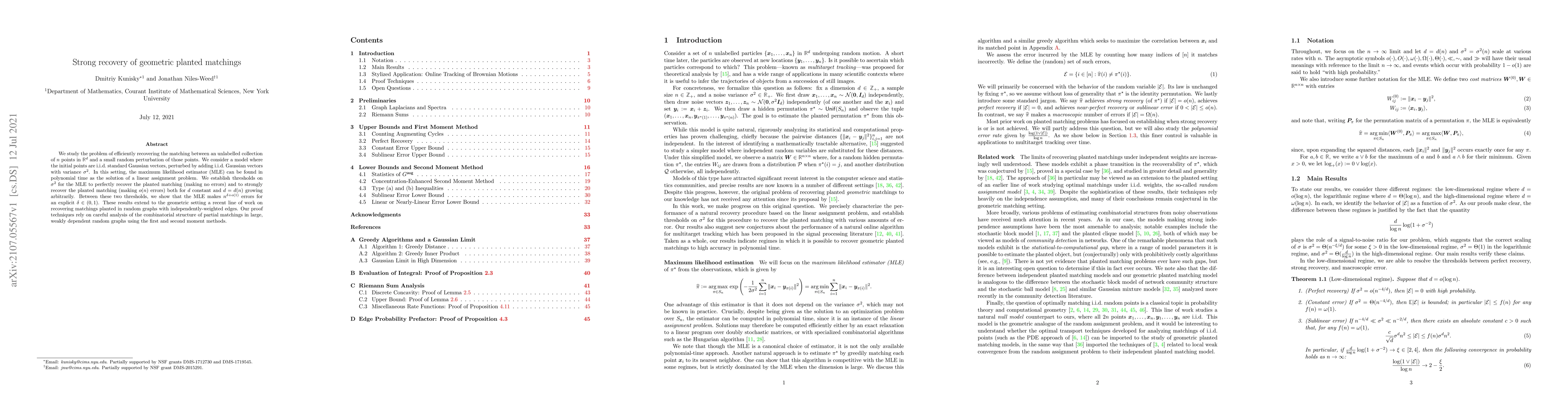 We study the problem of efficiently recovering the matching between an unlabelled collection of $n$ points in $\mathbb{R}^d$ and a small random perturbation of those points. We consider a model where the initial points are i.i.d. standard Gaussian vectors, perturbed by adding i.i.d. Gaussian vectors with variance $\sigma^2$. In this setting, the maximum likelihood estimator (MLE) can be found in polynomial time as the solution of a linear assignment problem. We establish thresholds on $\sigma^2$ for the MLE to perfectly recover the planted matching (making no errors) and to strongly recover the planted matching (making $o(n)$ errors) both for $d$ constant and $d = d(n)$ growing arbitrarily. Between these two thresholds, we show that the MLE makes $n^{\delta + o(1)}$ errors for an explicit $\delta \in (0, 1)$. These results extend to the geometric setting a recent line of work on recovering matchings planted in random graphs with independently-weighted edges. Our proof techniques rely on careful analysis of the combinatorial structure of partial matchings in large, weakly dependent random graphs using the first and second moment methods.