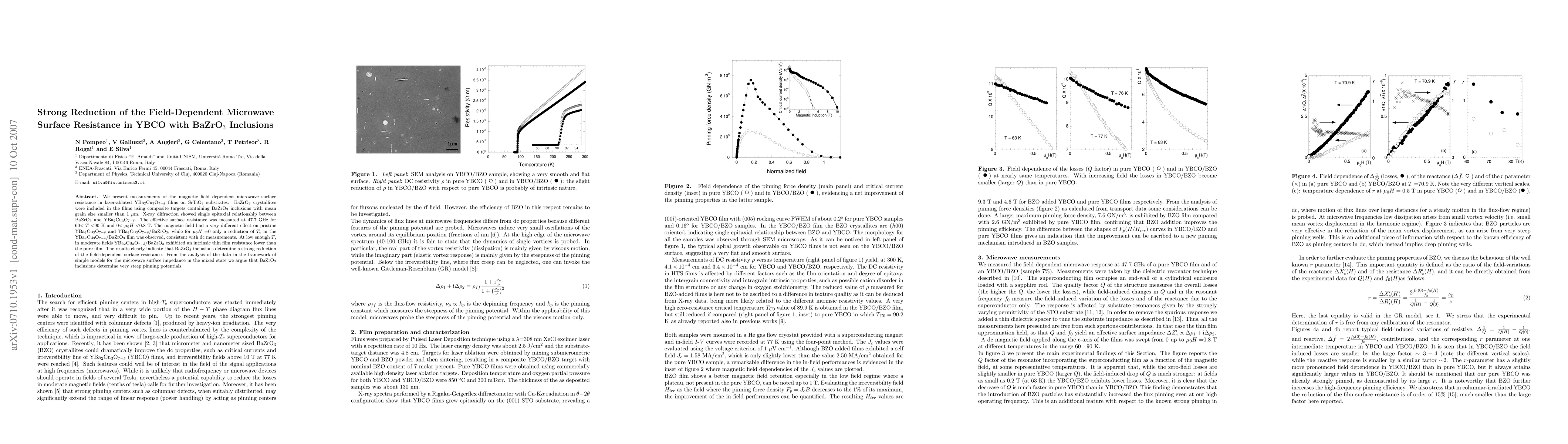 This study investigates the impact of BaZrO$_3$ inclusions on the microwave surface resistance in YBa$_2$Cu$_3$O$_{7-\delta}$ films under magnetic fields. The inclusions significantly reduce the field-dependent surface resistance, suggesting they create strong pinning potentials for vortices.