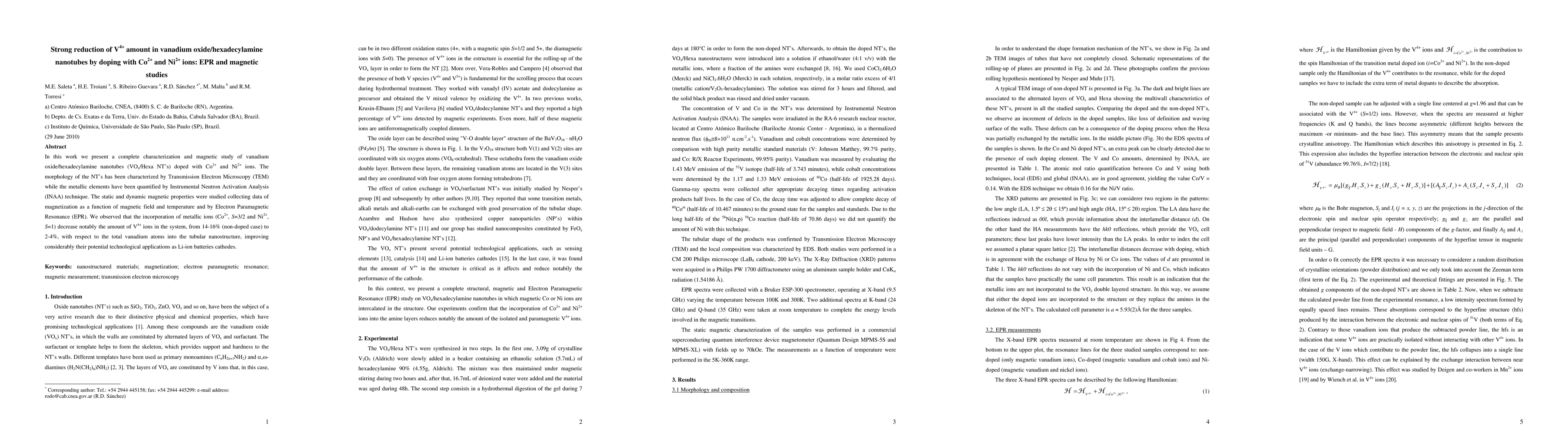 This paper investigates the doping of vanadium oxide/hexadecylamine nanotubes with Co2+ and Ni2+ ions, showing a significant reduction in V4+ ions from 14-16% to 2-4%, enhancing their potential for Li-ion batteries. The study uses TEM, INAA, and EPR to characterize the morphology and magnetic properties.